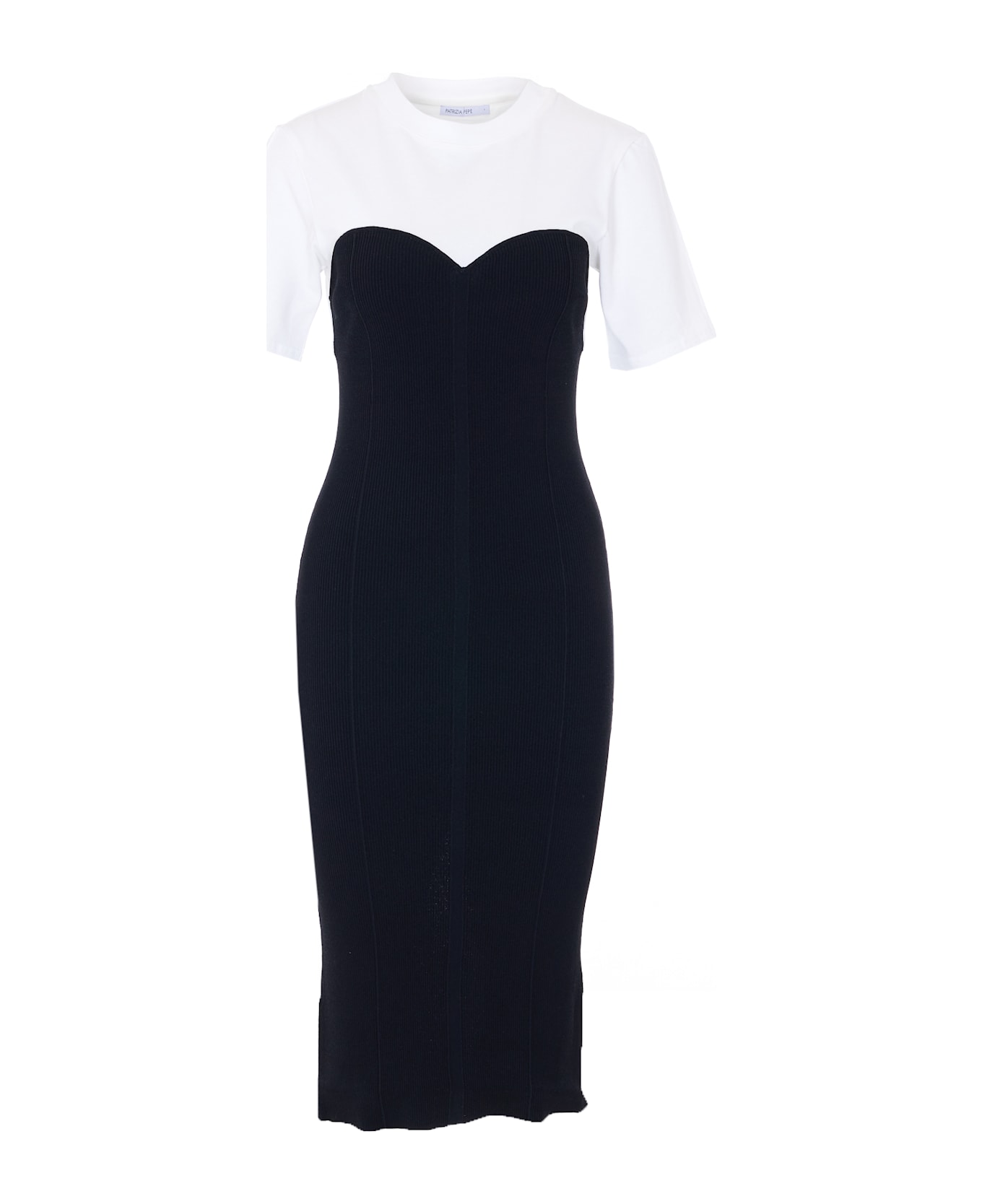 Patrizia Pepe black and white dress, short sleeves, elasticized fit, heart neck, v-neck on the back Composition: 75% Viscose, 22% Polyester
