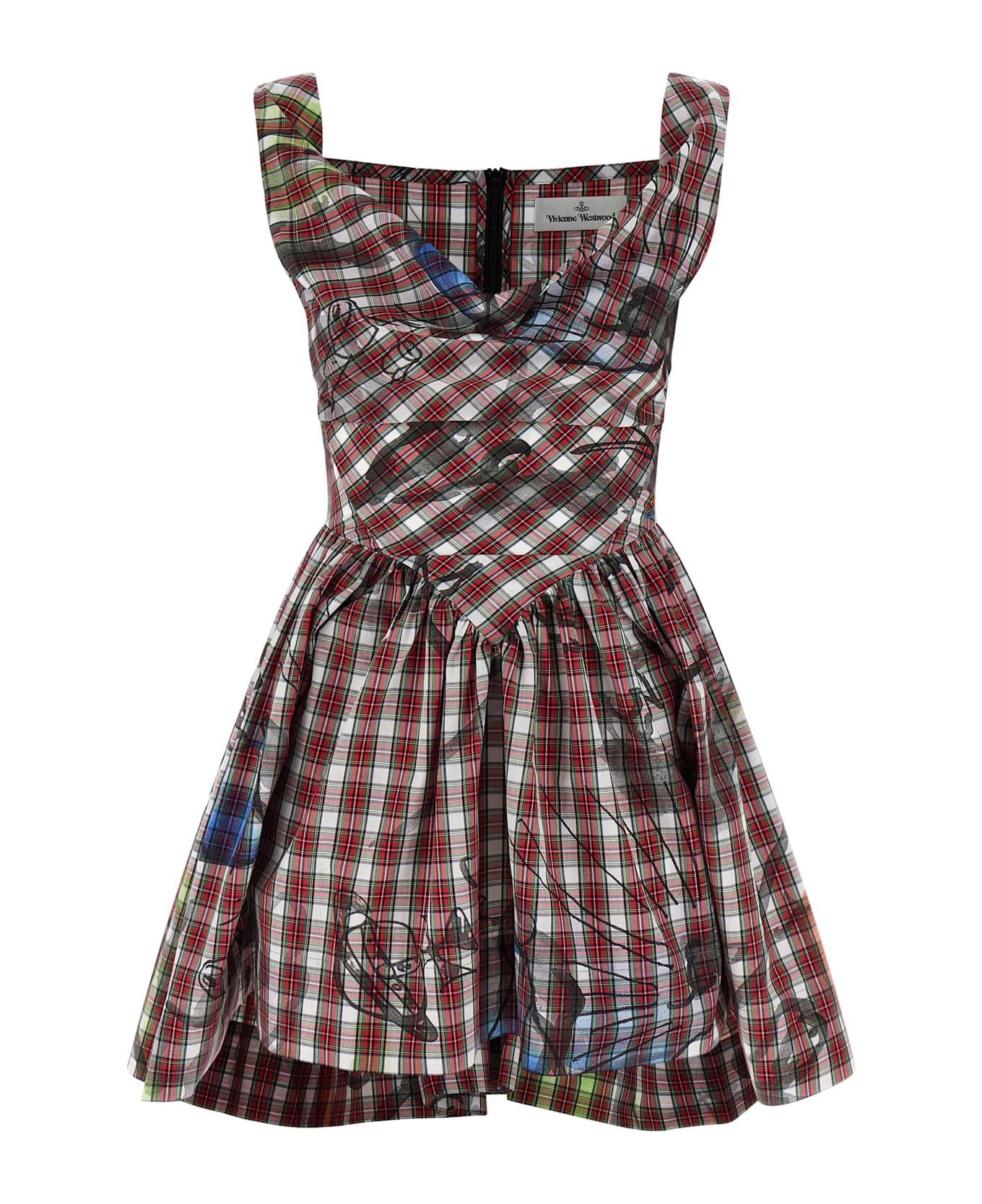 Mini Sunday' tartan cotton dress with Dominic Myatt hand-drawn print, corset corset, wide round neckline with draping, thick shoulder straps, sleeveless, back zip closure, front Orb logo embroidery, full skirt with ruffles and curls, unlined. SUSTAINABLE: This product is made with organic cotton.