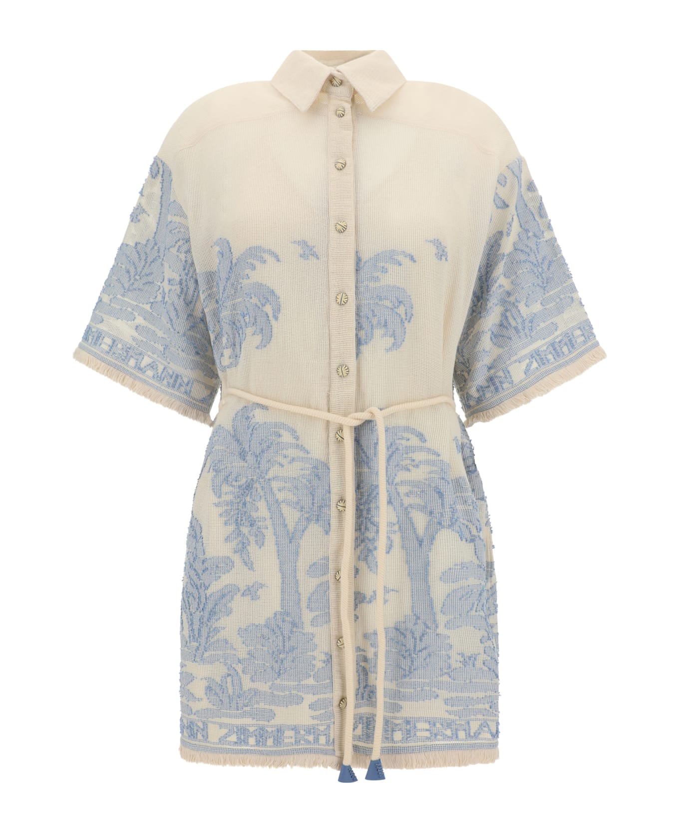 Cotton linen blend ottie palm shirt dress by zimmermann featuring a short-sleeved design, a classic collar, a front button closure, a multicolored floral pattern, a rope waistband, an opaque petticoat with thin straps, and a regular fit.