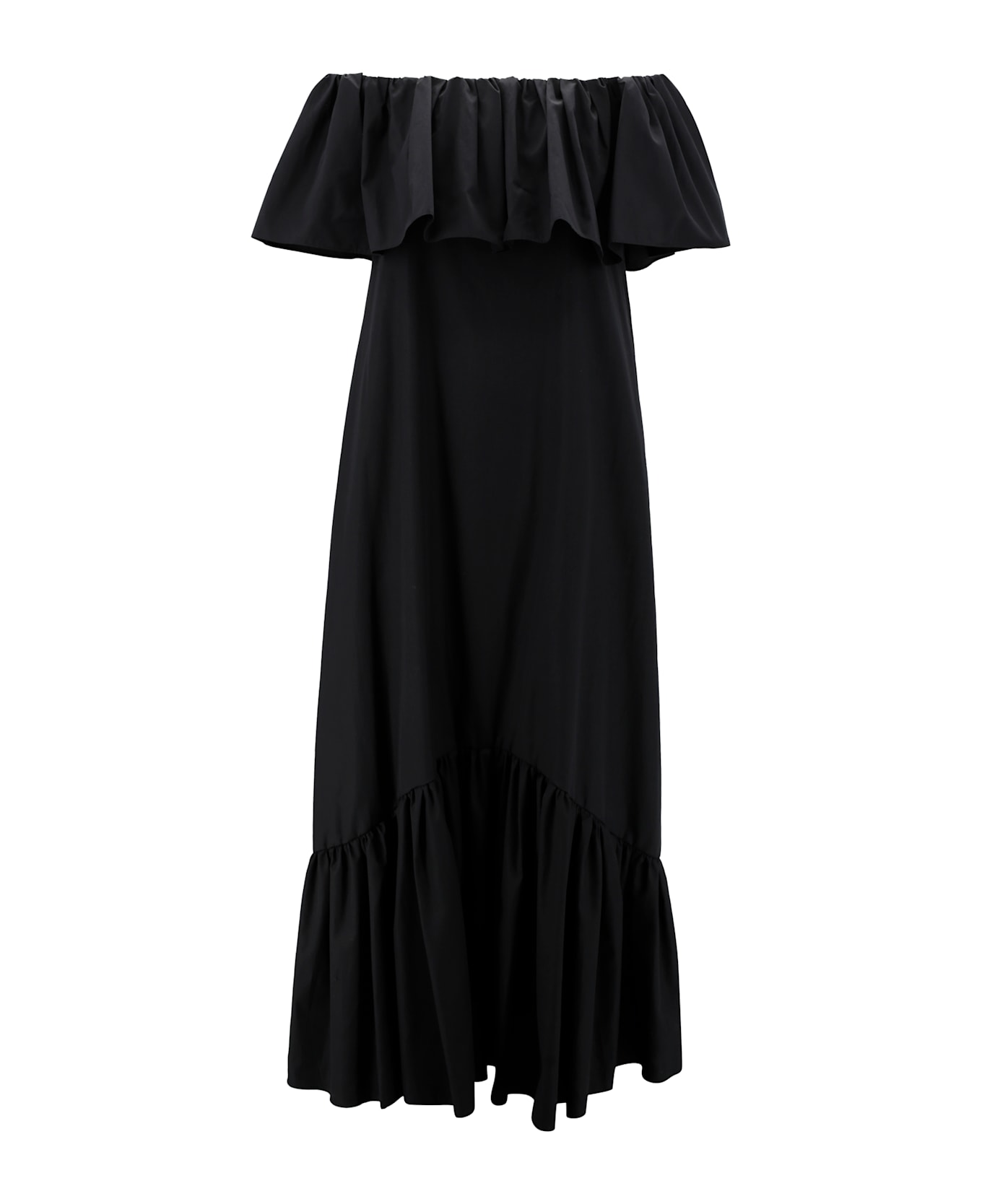 Off shoulder long dress in soft pure cotton poplin. Unlined model with a flared silhouette, featuring a wide silhouette with a flounce pattern on the bottom, straight neckline with ruffles revealing the shoulders and pockets inserted in the hips.