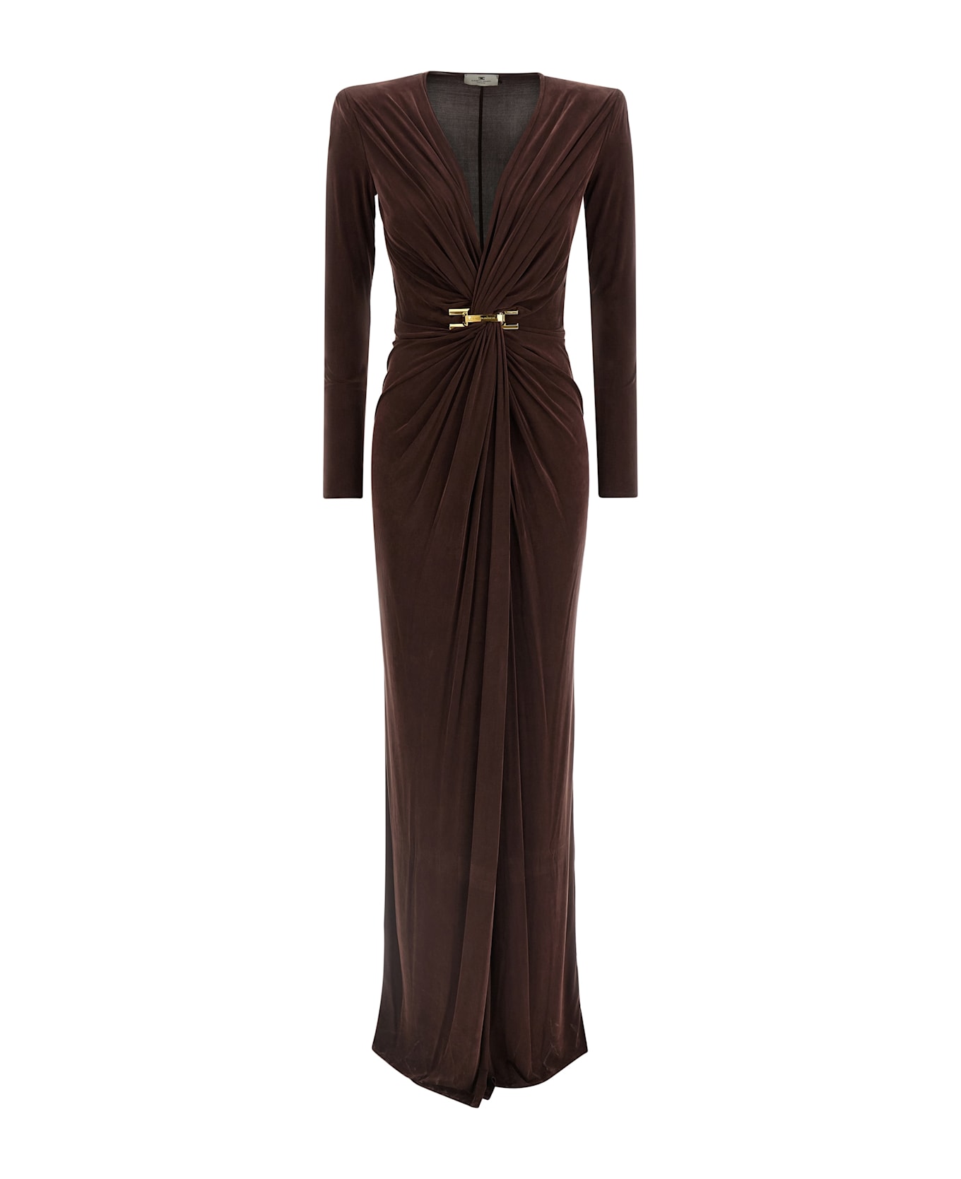 Long 'Red Carpet' dress in cupro jersey with wide front V-neck with draping, curling and jewel logo with rhinestones, padded shoulders, long sleeves, skirt with train and wide front split. Composition: 92% cupro, 8% elastane