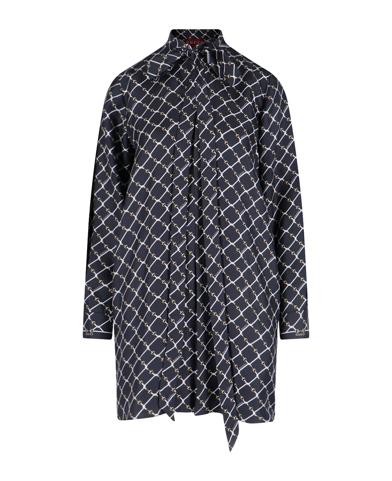 Gucci black silk mini dress with all-over horsebit print, high neck, long sleeves, bow detail at the front, straight hem. Composition: 100% Silk