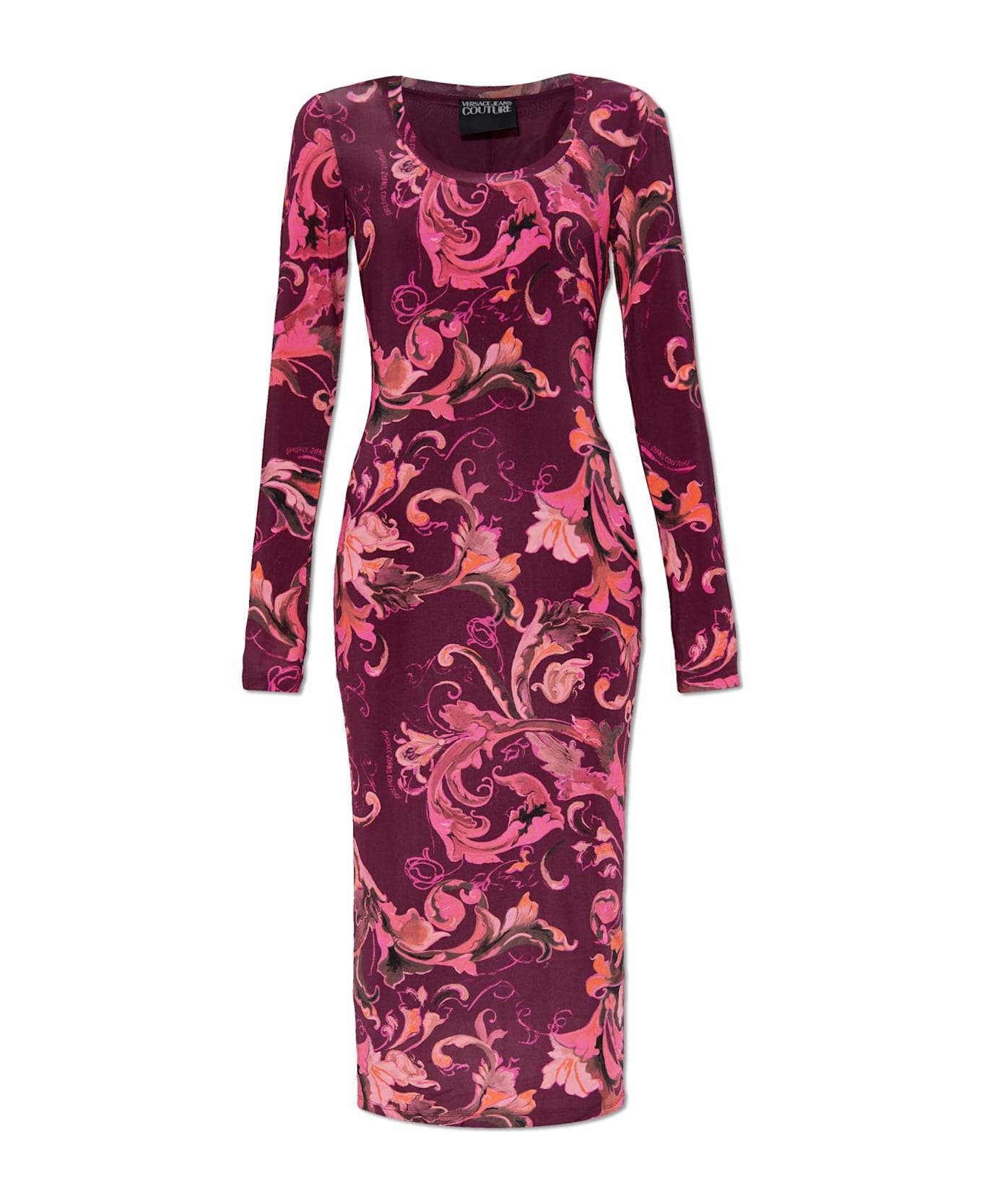 Step into a realm of sophistication with this Barocco Print Dress by Versace Jeans Couture. Impeccably tailored in a figure-defining bodycon silhouette, it gracefully falls to a refined midi length, complemented by long sleeves and a gently rounded neckline. The exquisite, elastic fabric elegantly hugs the contours of the body, creating a harmonious blend of comfort and modern allure. The masterful, asymmetrical baroque print rich in shades of pink, violet, and subtle orange radiates opulence and distinctive artistry. An integrated signature