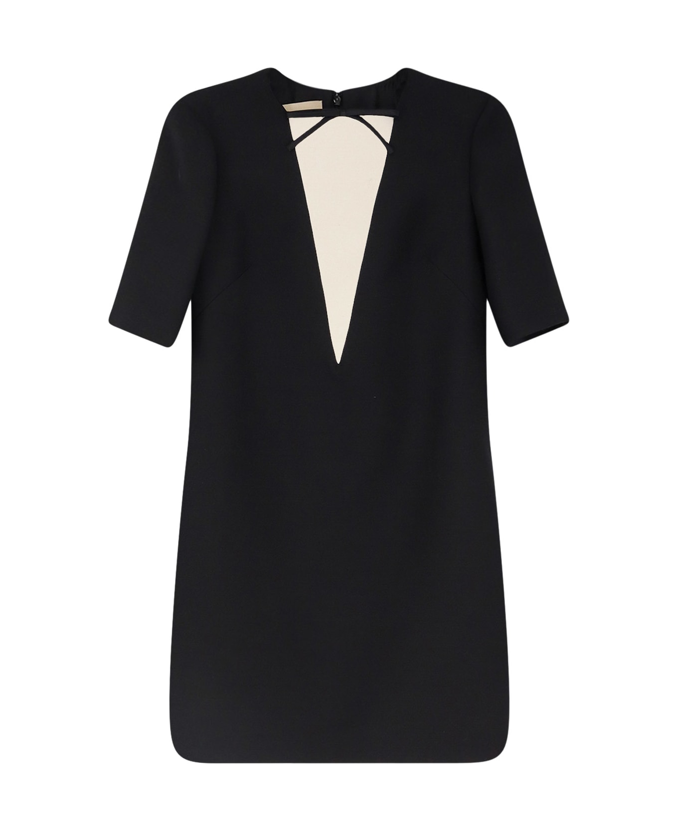Zip and hook-and-eye closure at the back Squared neckline with bow Short sleeves Contrasting insert on the front Made in Italy 65% virgin wool, 35% silk Lining: 100% silk SKU: 8B3VAHZ71CF0NA