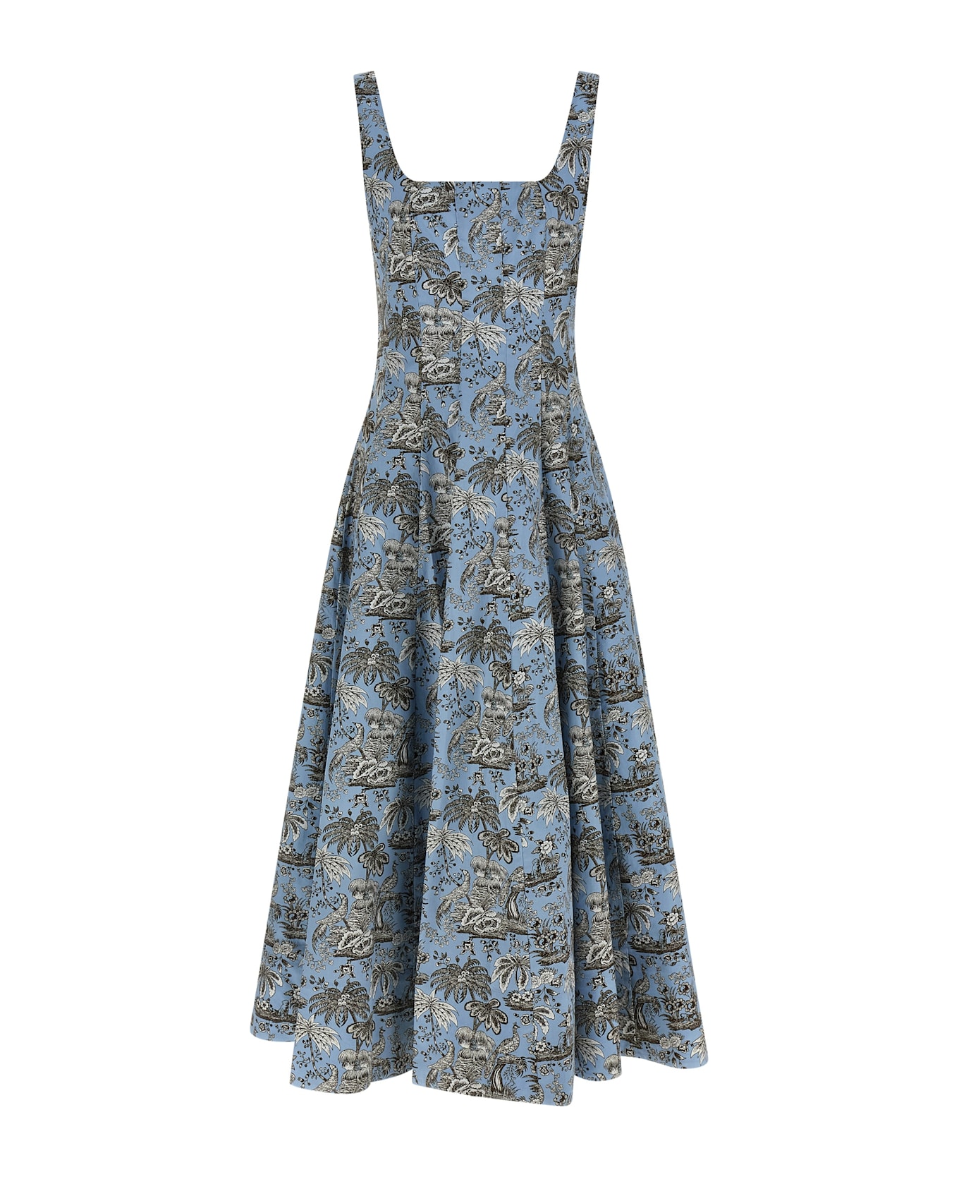 'Wells' midi dress in light cotton poplin with Sky Tolile print, upper part with corset-style panel structure, flared skirt, front square neckline, wide round neckline and back zip closure, sleeveless, lining.