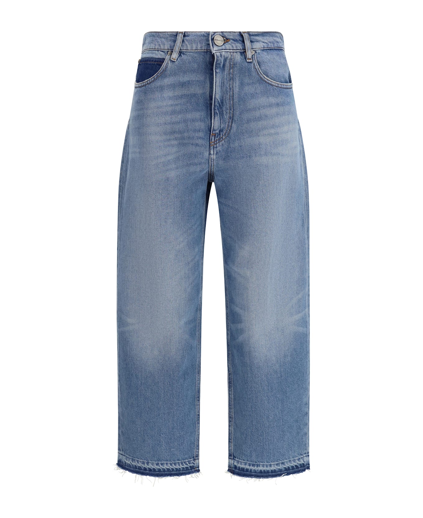 The balloon fit jeans in faded denim by pinko deliver contemporary attitude with a lived-in appeal. crafted from cotton and lyocell denim in a medium wash, they feature a low-rise five-pocket design with a rounded upper leg that tapers toward the hem. faded effects and a reserve-treated hem create a deconstructed finish, while darker contrasts on the coin pocket, back patch and hem enhance the distinctive character. the iconic love birds embroidery on one back pocket signs the design with a recognizable and refined touch.
