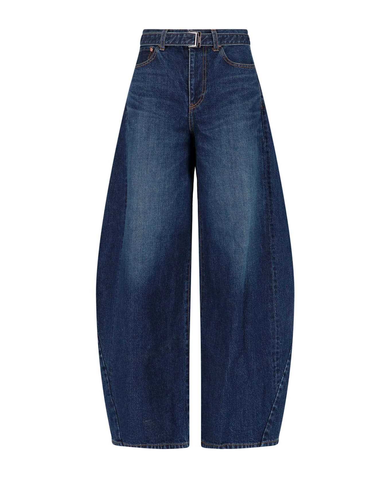 Sacai wide barrel jeans in blue cotton denim, high waist, button and zip closure, adjustable buckle belt at the waist, five pockets design, back cargo pocket, wide leg. Composition: 100% Cotton