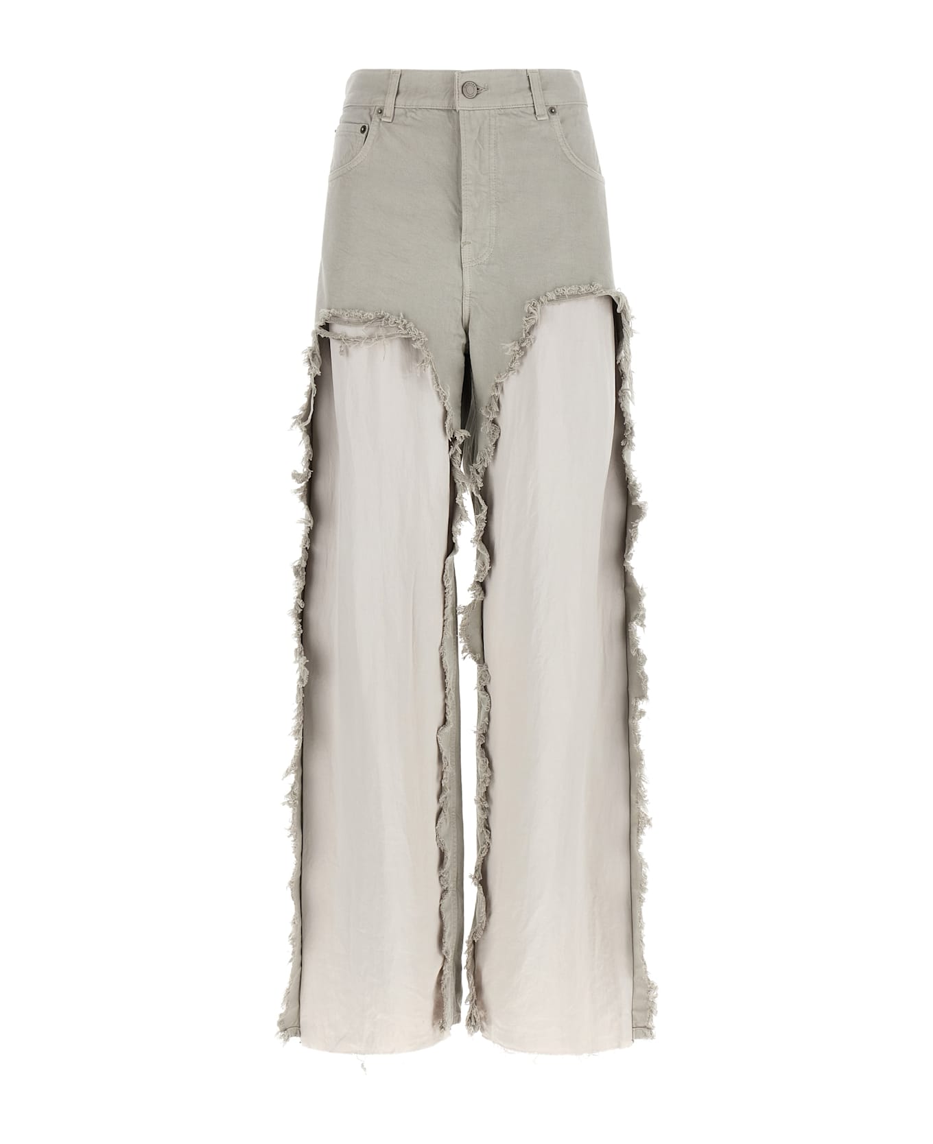 Bull 'Bonnie' cotton denim jeans, front breaks and rips with tonal satin insert, wide flared leg, front zip and button closure, five pockets, back logo tag, and asymmetric leg bottom.
