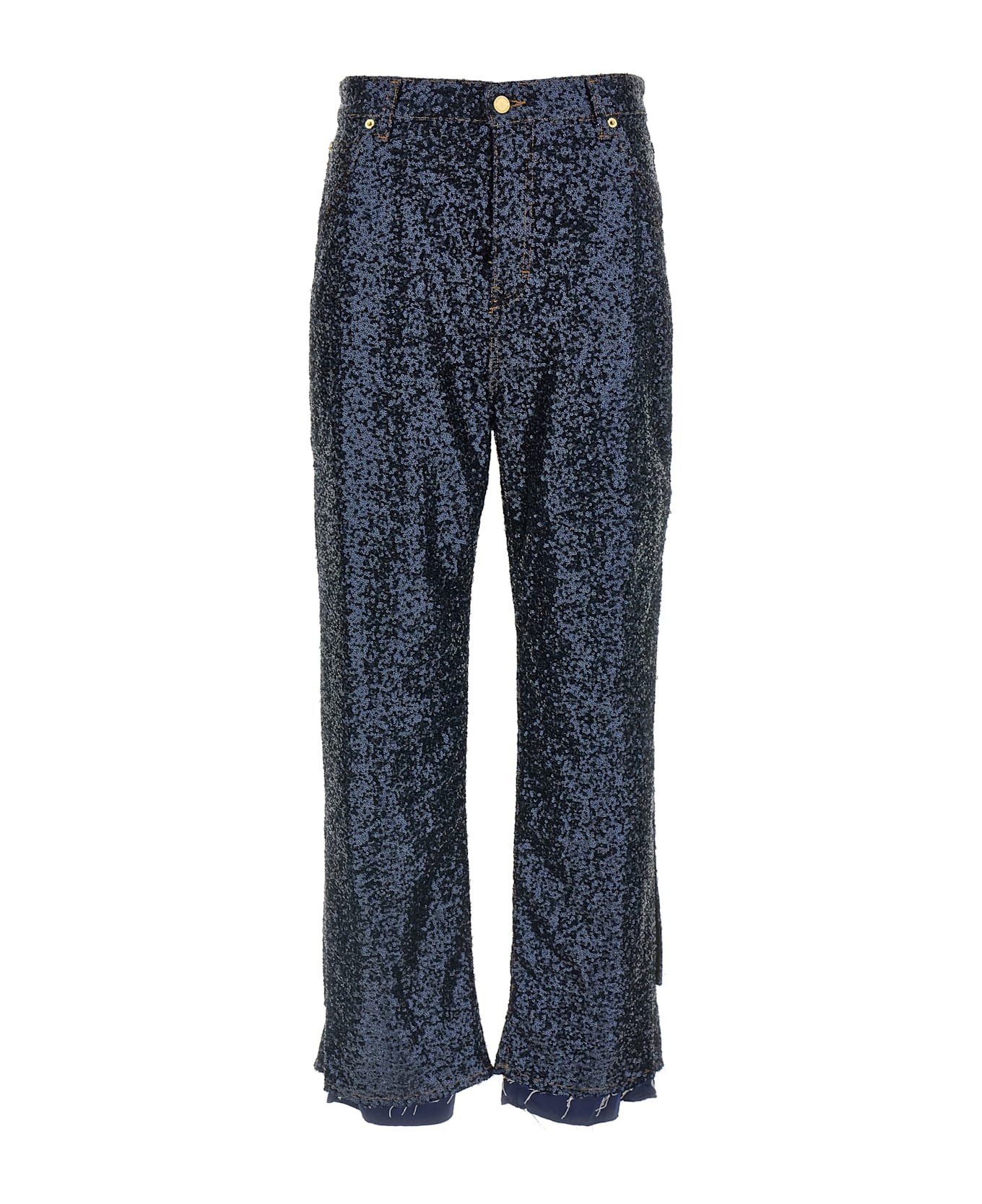 'Lisa' cotton denim jeans with all-over sequin appliqué, contrast stitching, belt detail on the left leg, front zip and button closure, five pockets, raw cut hem and slits, leather logo label on the back.