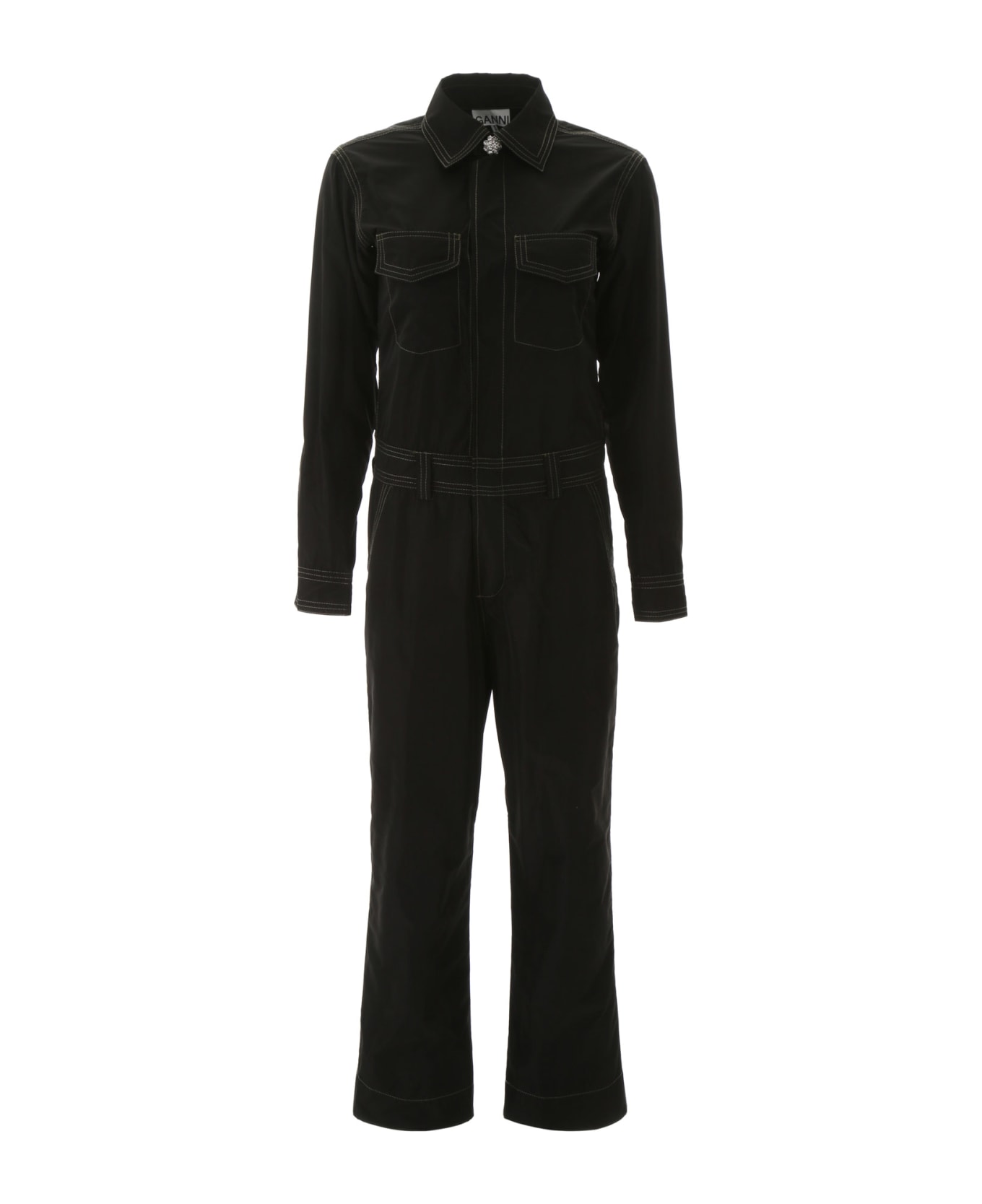 Ganni jumpsuit in Eco Circle recycled fabric. It features concealed buttons and a crystal button on the neck. Flap pockets on the chest, side and back pockets on the trousers. Contrast seams. Model height is 177 cm and she is wearing a size FR 34. Composition: 100% poliestere