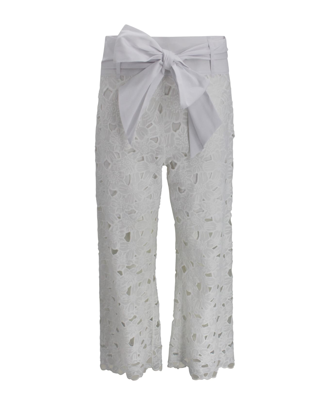 Trousers crafted from embroidered Sangallo cotton, featuring a high waist and a fabric belt that enhances the silhouette. The lightweight design makes them ideal for warm-weather styling.
