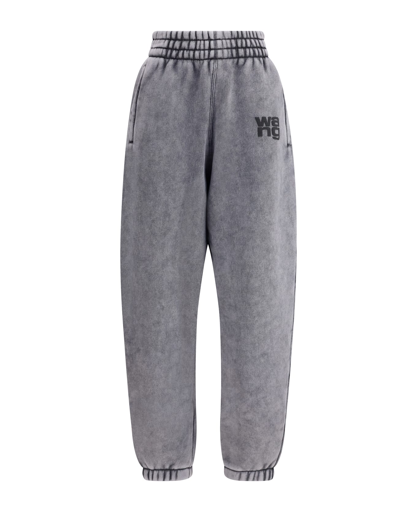 The grey puff-print logo sweatpants by alexander wang combine comfort with contemporary style. crafted from a brushed cotton blend, they feature an elastic waistband, zip pockets, and a distinctive stacked puff-print logo. the washed blue bicoloring adds a unique touch, making these sweatpants perfect for modern casual looks.