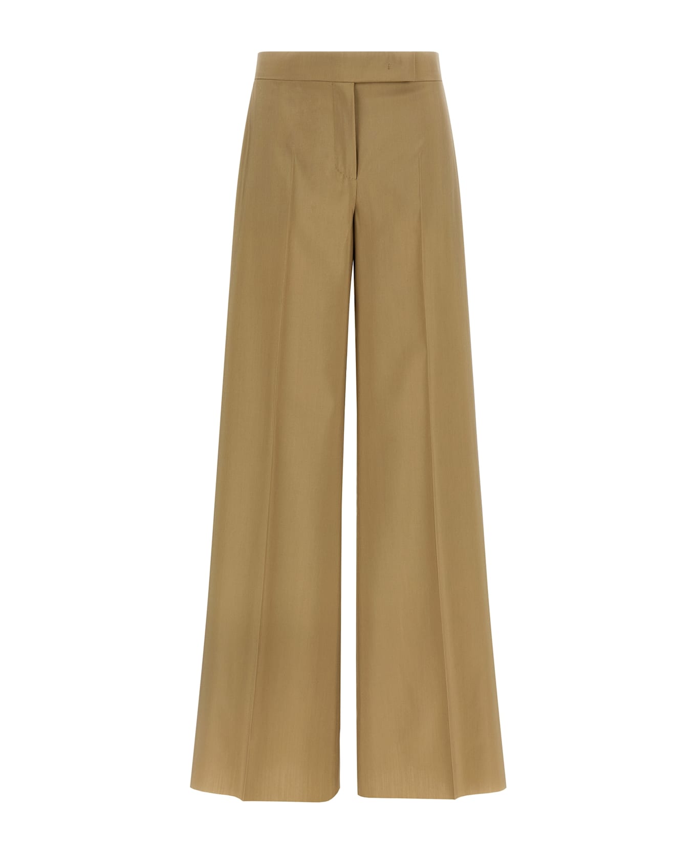 'MxsBronte' trousers in light wool and silk poplin finished with tailored point, tailored-inspired model, wide and straight leg, stretched pleat, zip hook and front button closure, front French pockets, horizontal welt buttons and pins and pockets with button at the back, stretch fabric lining, hem at the bottom of the leg to be finished.