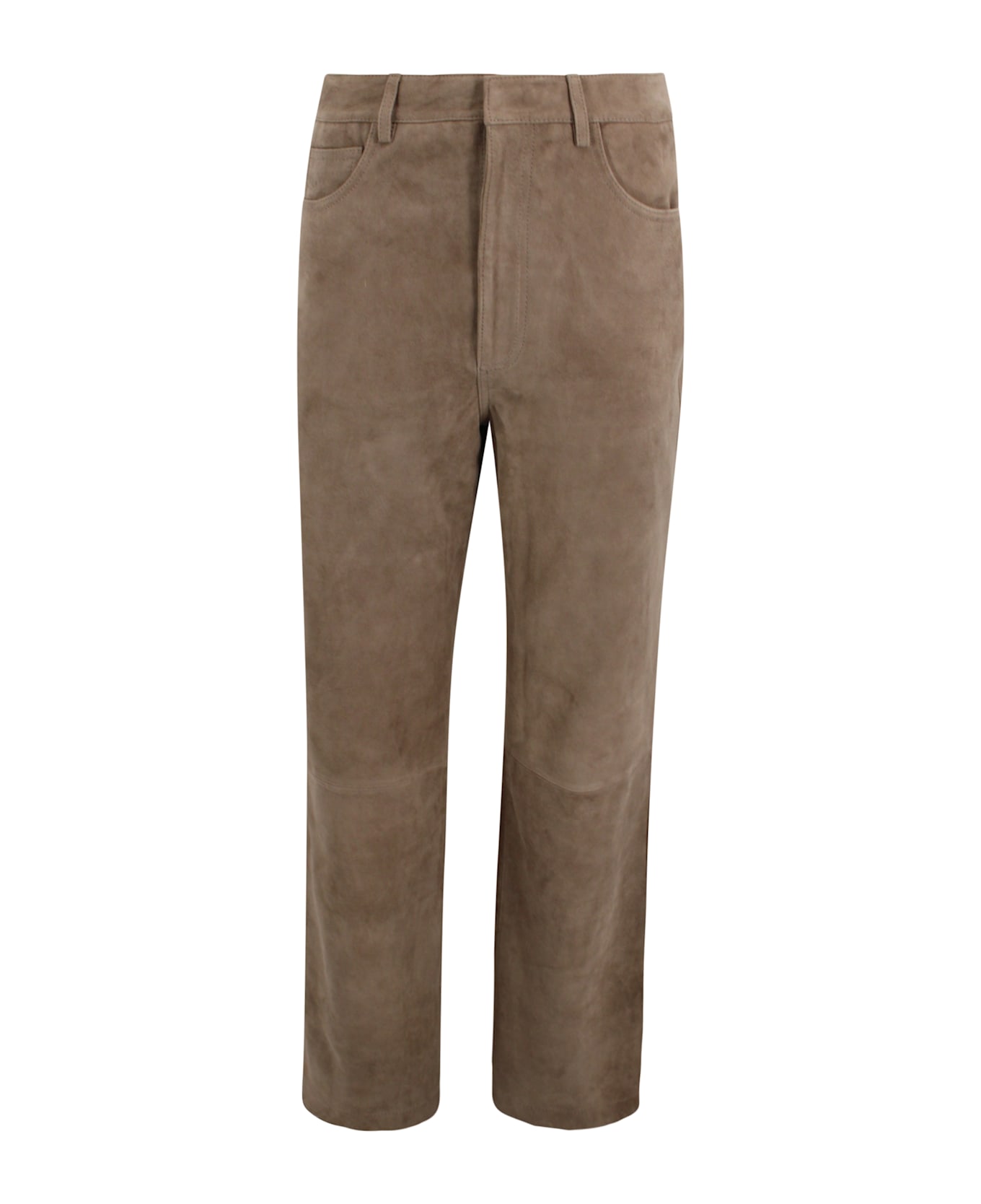 Trousers crafted in brown suede leather, featuring a straight-leg cut and a five-pocket design. The style includes belt loops and rear patch pockets, offering a clean yet distinctive look suitable for refined, contemporary outfits. Features Color: brown Material: suede leather Straight-leg cut Five-pocket design Belt loops Rear patch pockets