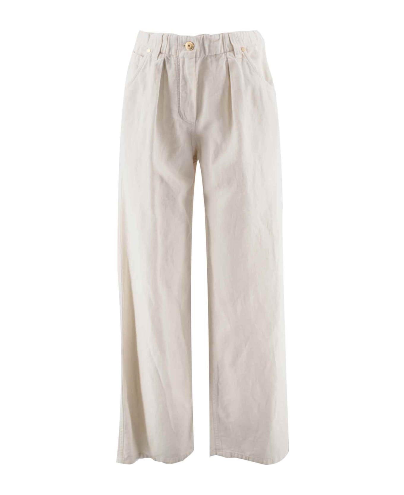 Straight high-waisted trousers in linen and cotton blend, elasticated waist, belt loops, front closure with buttons and zip, two side welt pockets, two back welt pockets and straght cut. Composition: 60% Cotton, 40% Linen