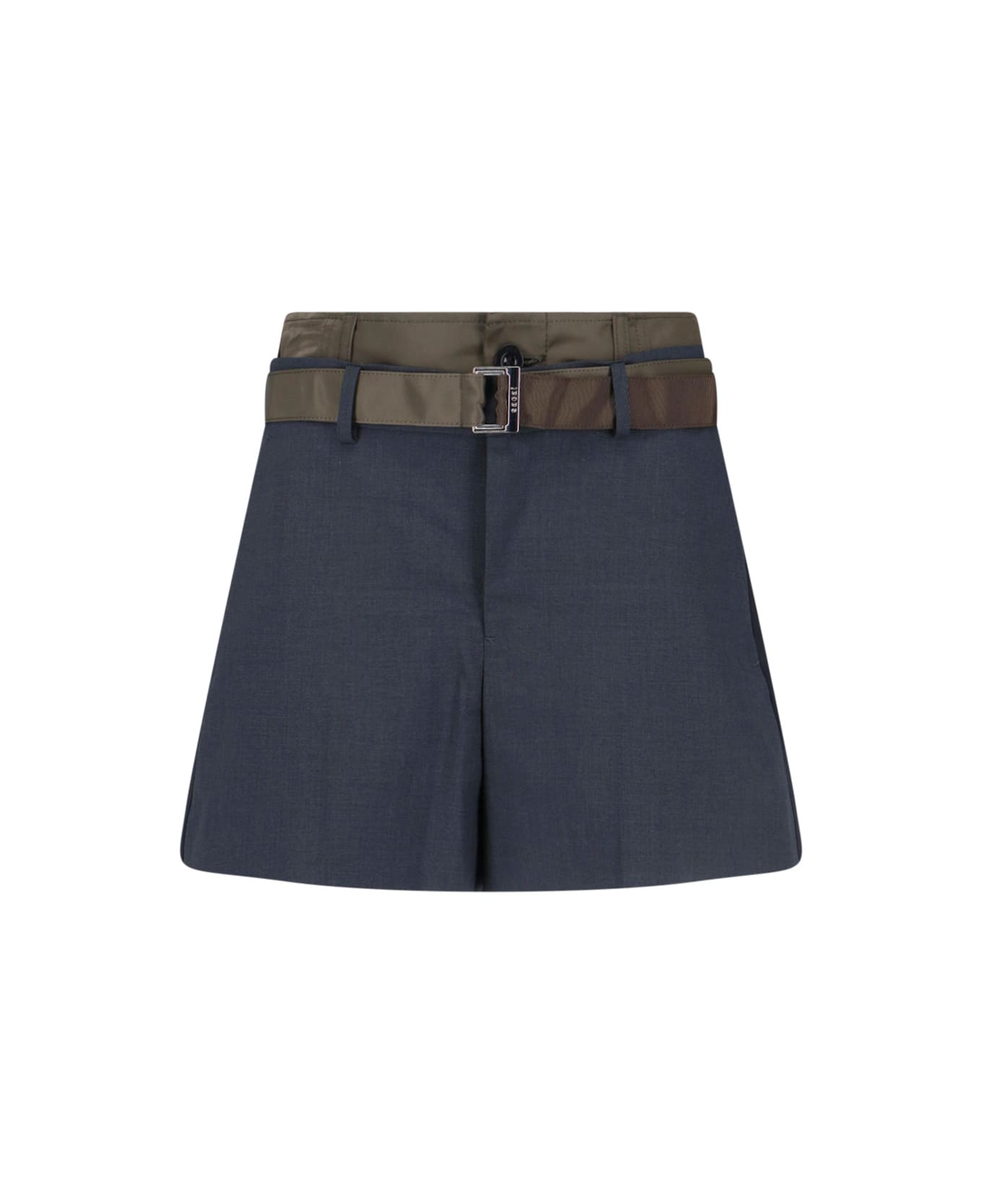 Sacai grey wool blend shorts with mid waist, button and zip closure, front buckle belt detail, two side slanted pockets, two back button pockets, straight leg Composition: 70% Polyester, 30% Wool