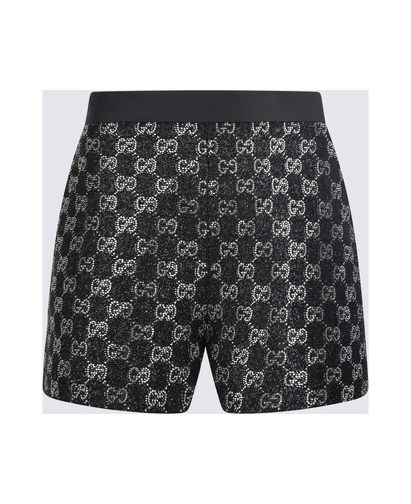 Black viscose shorts from Gucci featuring elasticated waist, all over silver tone monogram and regular vestibility. Composition: _, 46% Viscose, 21% Metallic Fiber, 20% Polyamide, 7% Polyester, 6% Cotton