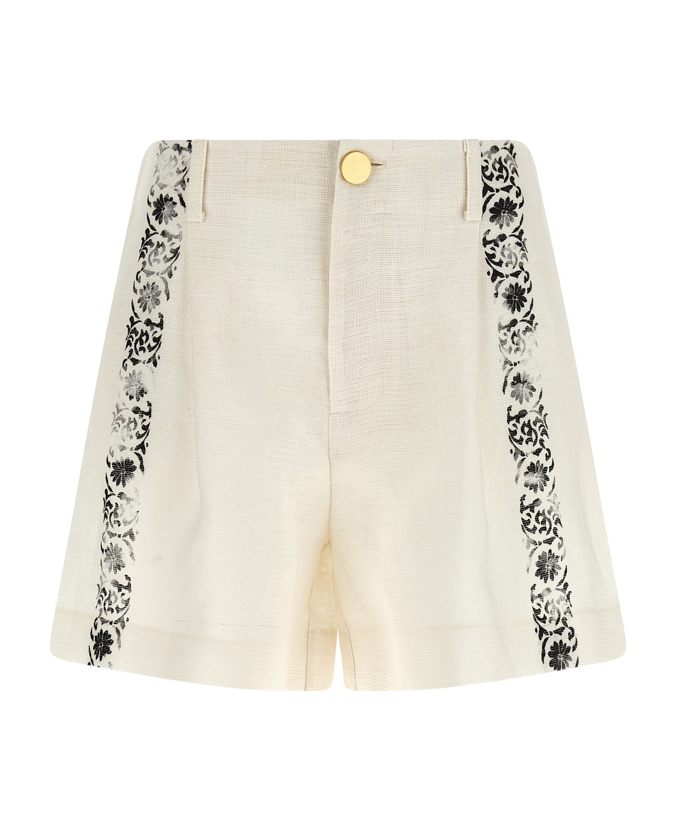 Pure linen shorts with 'Fortuny' inspired print with stripes and geometries obtained by placed print, high waist, pins, wide leg, zip and front button closure, French pockets.