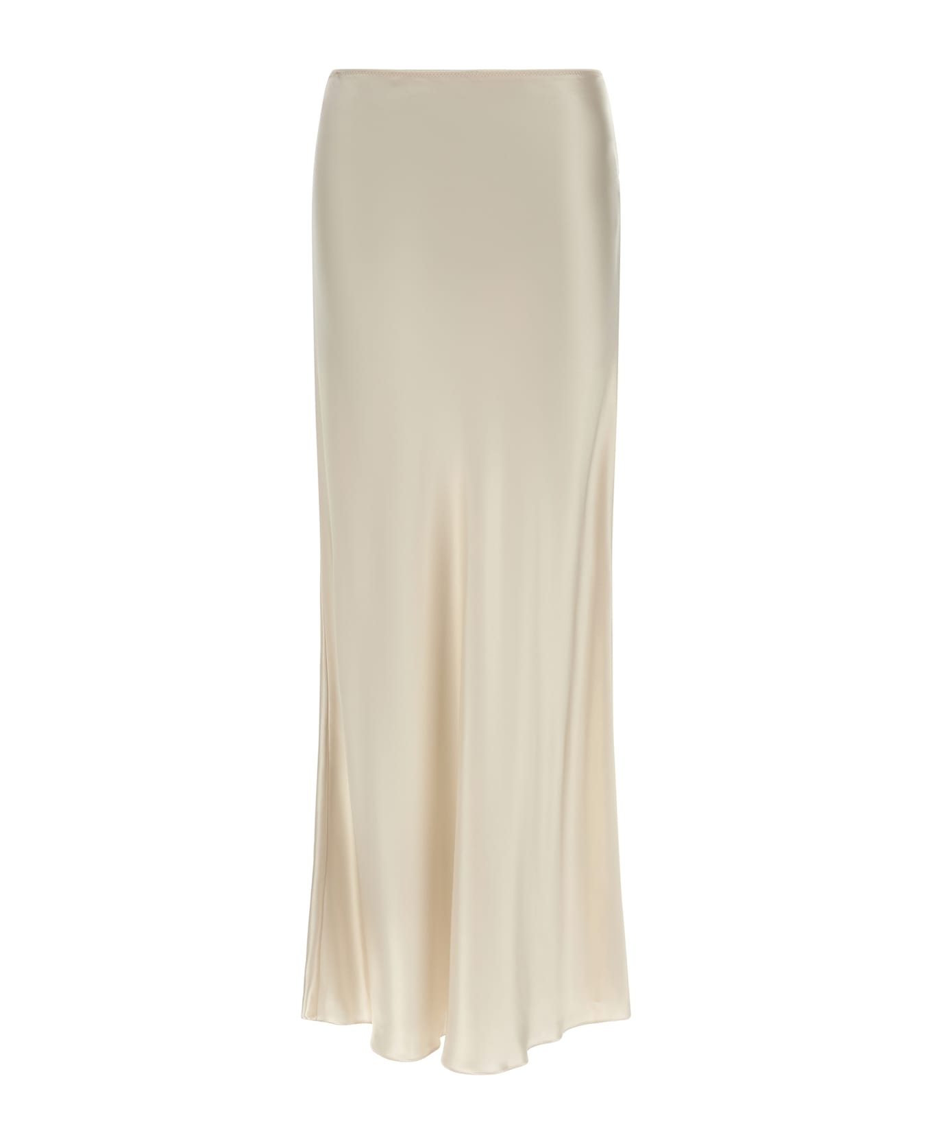 Long skirt in mirrored effect viscose satin, asymmetrical flared silhouette with side pleats, elastic waistband. Composition: 100% viscose