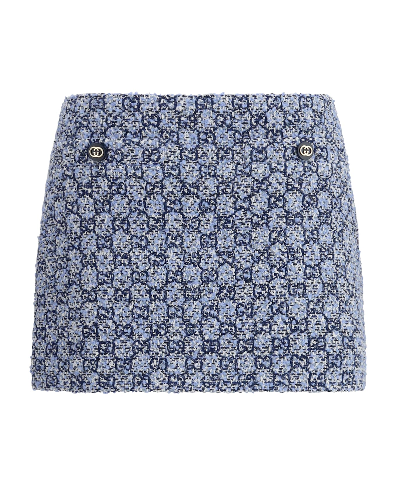 The gg tweed skirt with belt loops and side zip closure by gucci reflects structured elegance through the iconic gg tweed construction. fully lined for comfort and shape, it features two side pockets alongside two logo-button pockets that add distinctive functionality. this skirt by gucci blends heritage appeal with contemporary refinement in a sophisticated and recognizable design.
