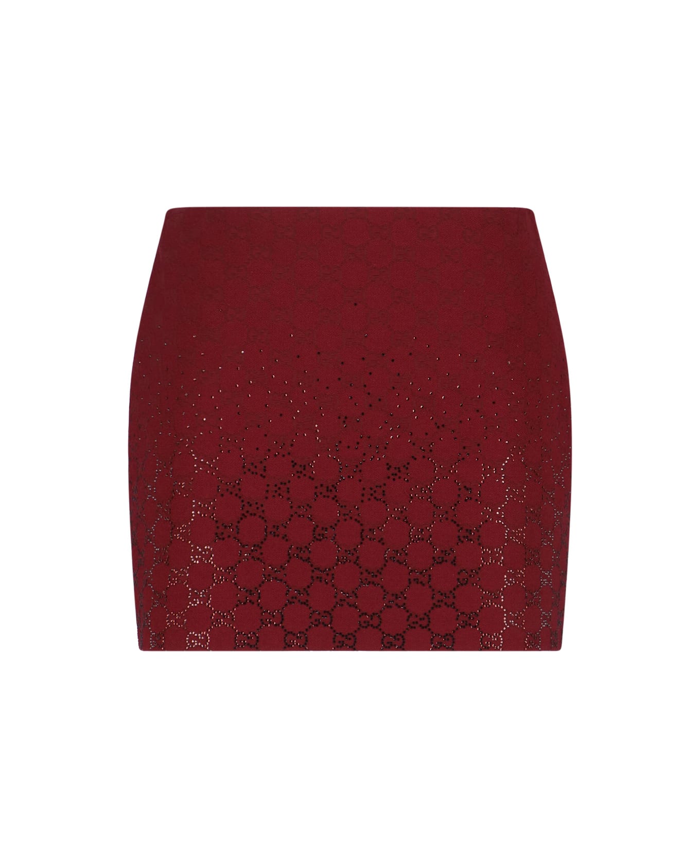 Gucci "gg supreme" red cotton mini skirt with all-over gg supreme pattern and rhinestones, side zip closure, straight hem. Composition: 100% Cotton