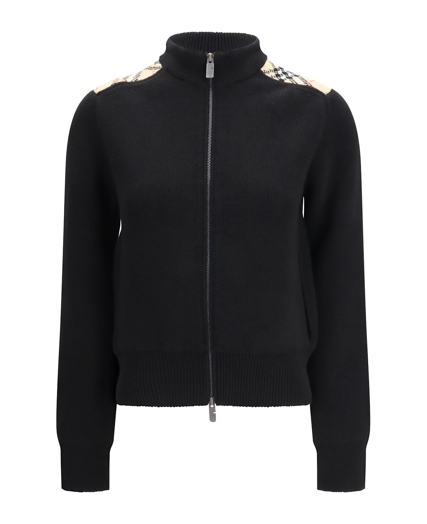 The cashmere and wool cardigan by burberry with check appliqués is a refined and comfortable garment, featuring a double-slider zipper closure and side patch pockets. ribbed trim completes the design, adding a distinctive, tailored touch that is ideal for elegant and versatile looks.