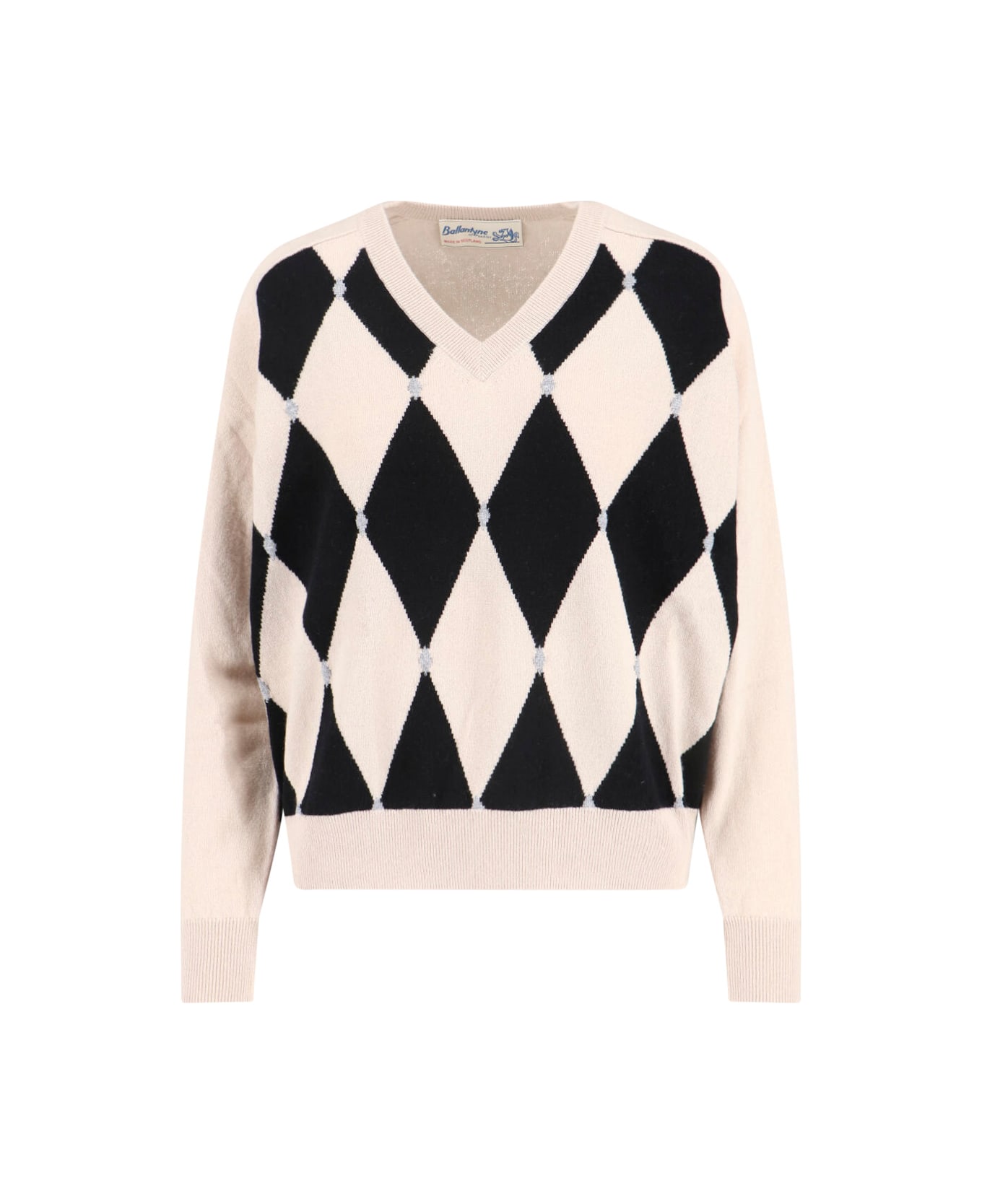 Ballantyne beige cashmere sweater with V-neck, long sleeves, contrast intarsia pattern at the front, ribbed trim, straight hem. Composition: 100% Cashmere