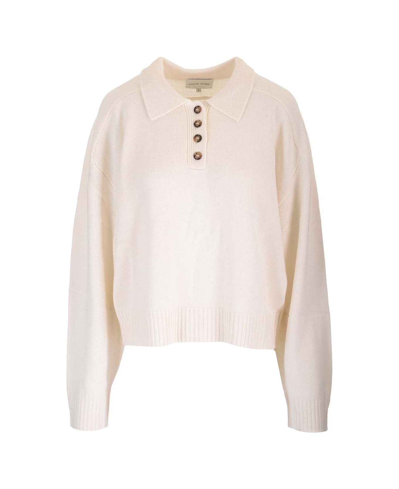 Polo shirt-style sweater in off-white cashmere knit from Lou Lou Studio, with a relaxed fit, ribbed hems, classic collar with buttons.