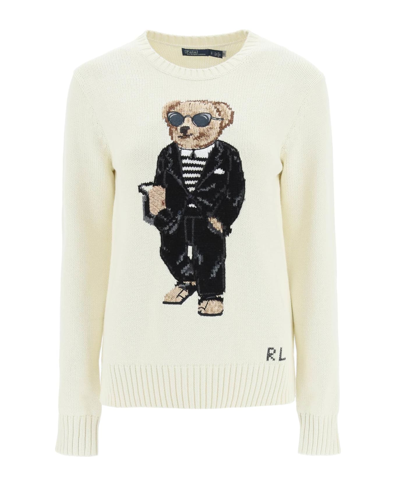 Polo Ralph Lauren crew-neck cotton sweater embellished with Teddy front intarsia and embroidered logo detail above the hem. Ribbed trims, small side vents, loose fit. The model is 177 cm tall and wears a size XS.