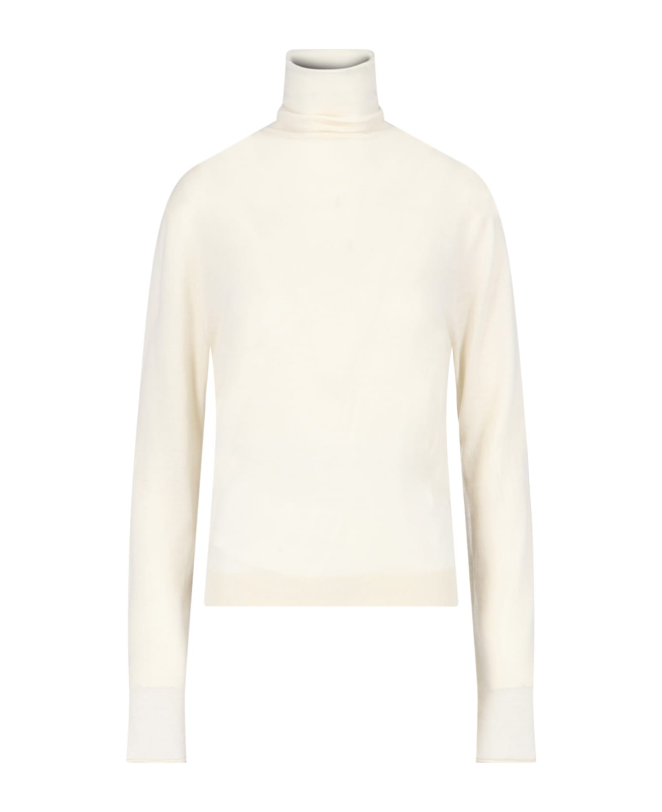 Extreme Cashmere "Thunder" Turtleneck, in cream cashmere with multicolor logo embroidery on the side, ribbed trims, straight hem.