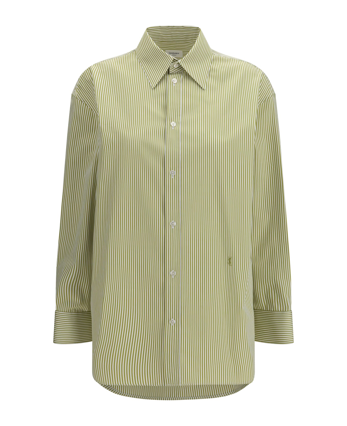 The vertical striped button shirt with long sleeves and classic collar by saint laurent embodies timeless elegance through clean lines and balanced proportions. the vertical stripe pattern enhances the silhouette, while the embroidered logo adds a subtle yet distinctive signature. the streamlined construction ensures a refined and versatile finish, making this shirt by saint laurent a sophisticated wardrobe essential.