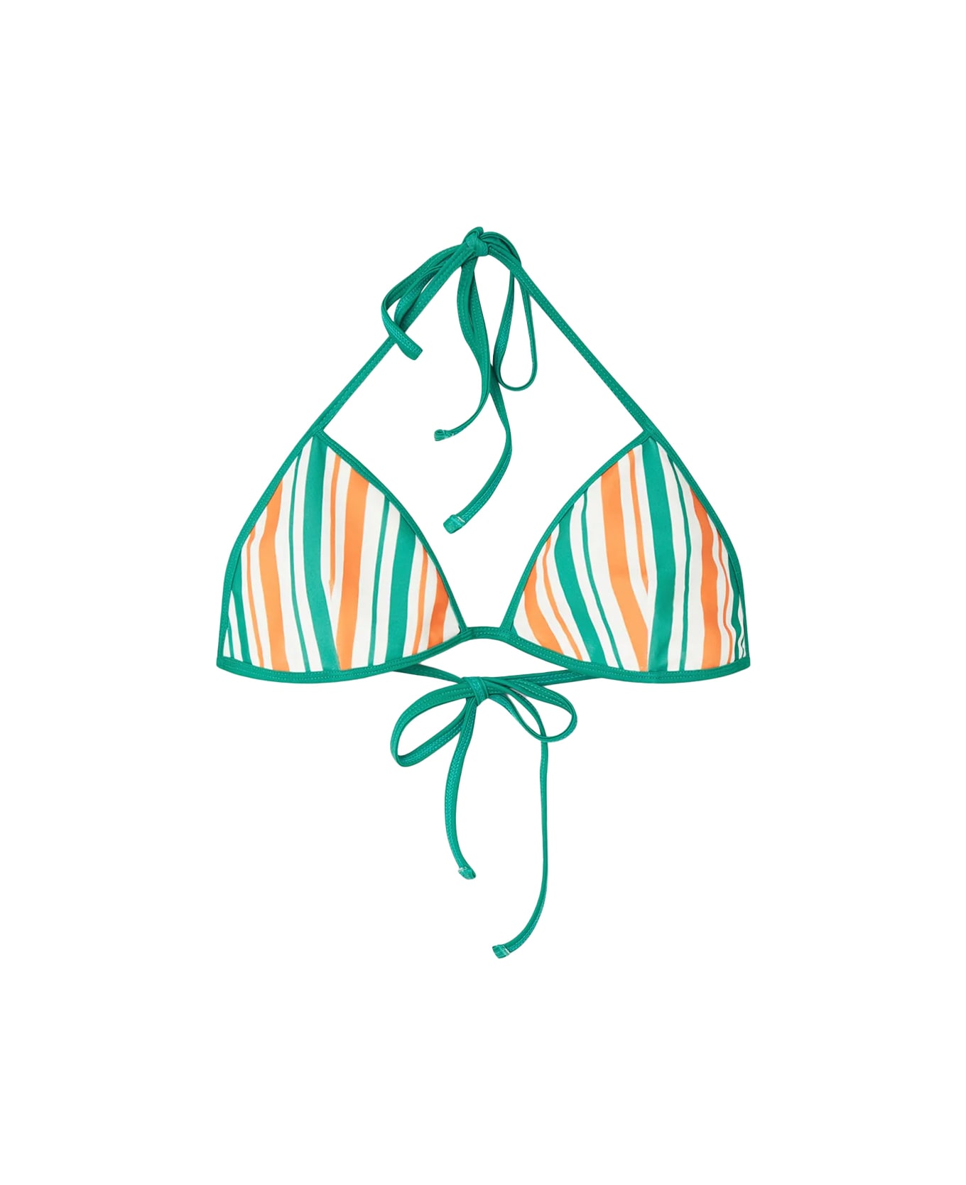 Casablanca triangle bikini top made of multicoloured striped fabric with green piping and fastening at the back. This piece is completed with removable padding and must be worn with the matching briefs.