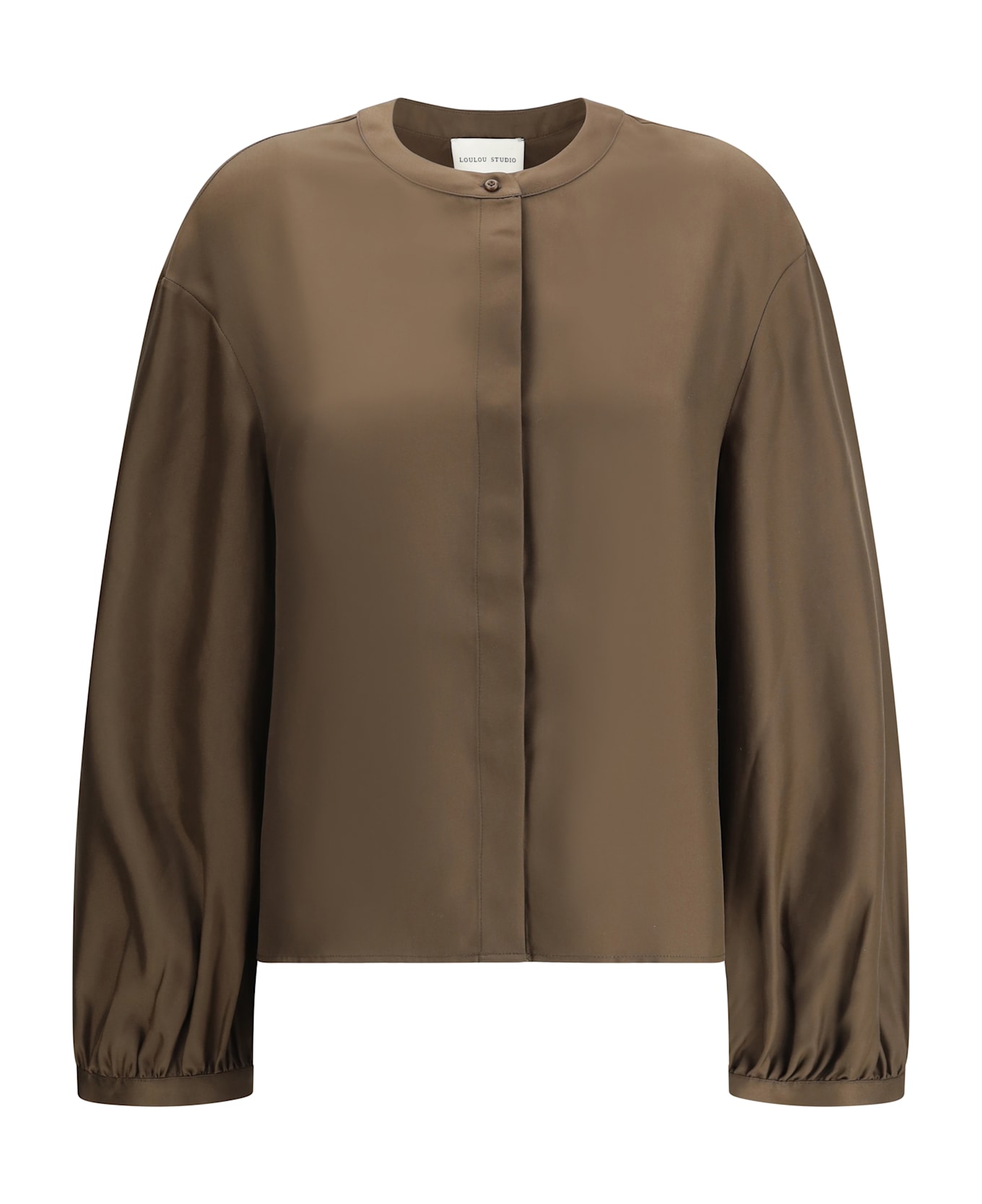 The lea satin shirt by loulou studio is an elegant and refined garment. the crew neck collar gives a simple yet sophisticated look, while the front closure with hidden buttons gives a clean, modern finish. the slightly balloon sleeves add a touch of romance and originality, making the design more interesting and feminine. finally, the satin fabric gives a delicate sheen that accentuates the elegance of the garment.