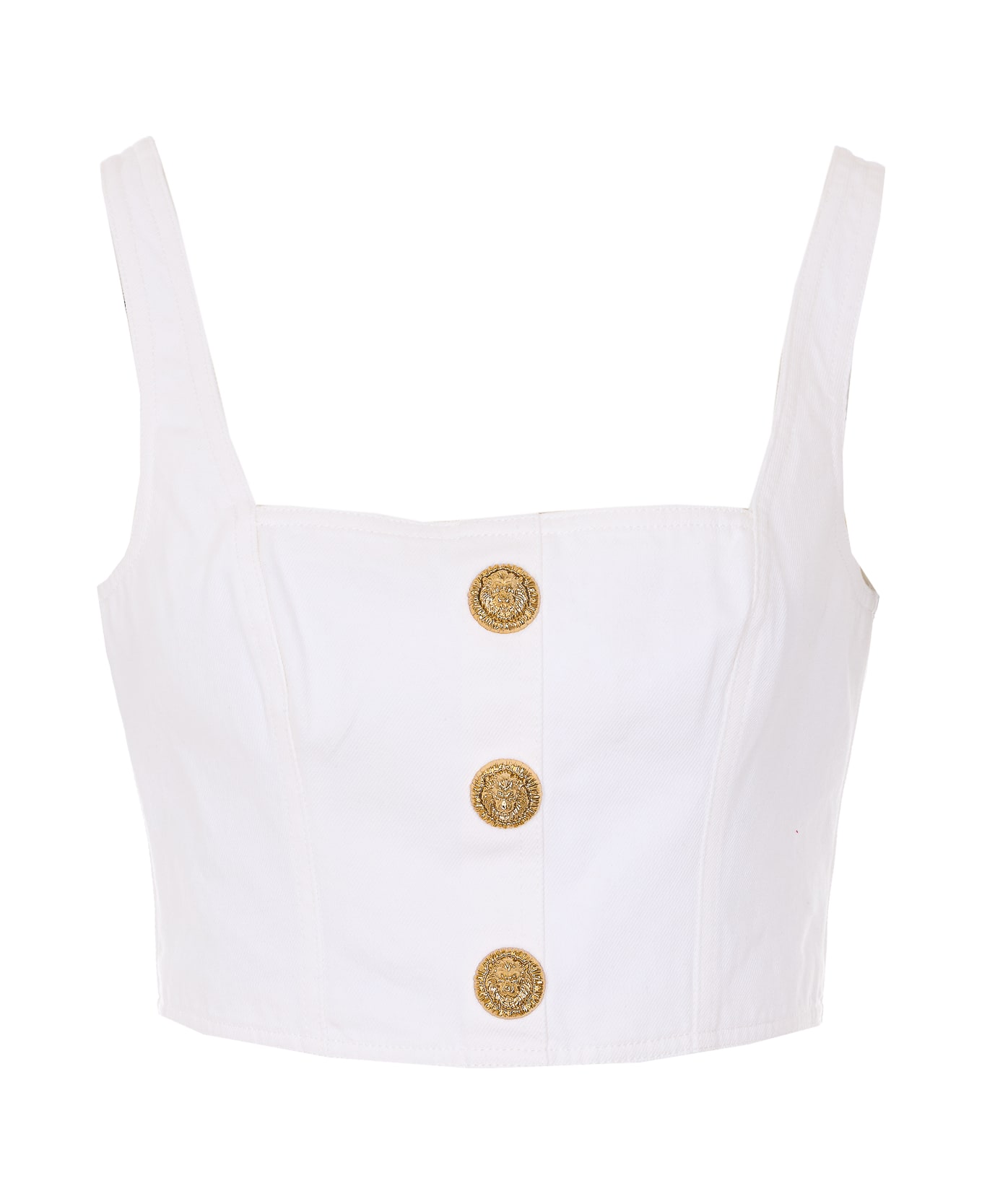 Balmain white buttoned denim top, maxi jewels details, crop top Composition: 100% Cotton, 65% Polyester, 35% Cotton
