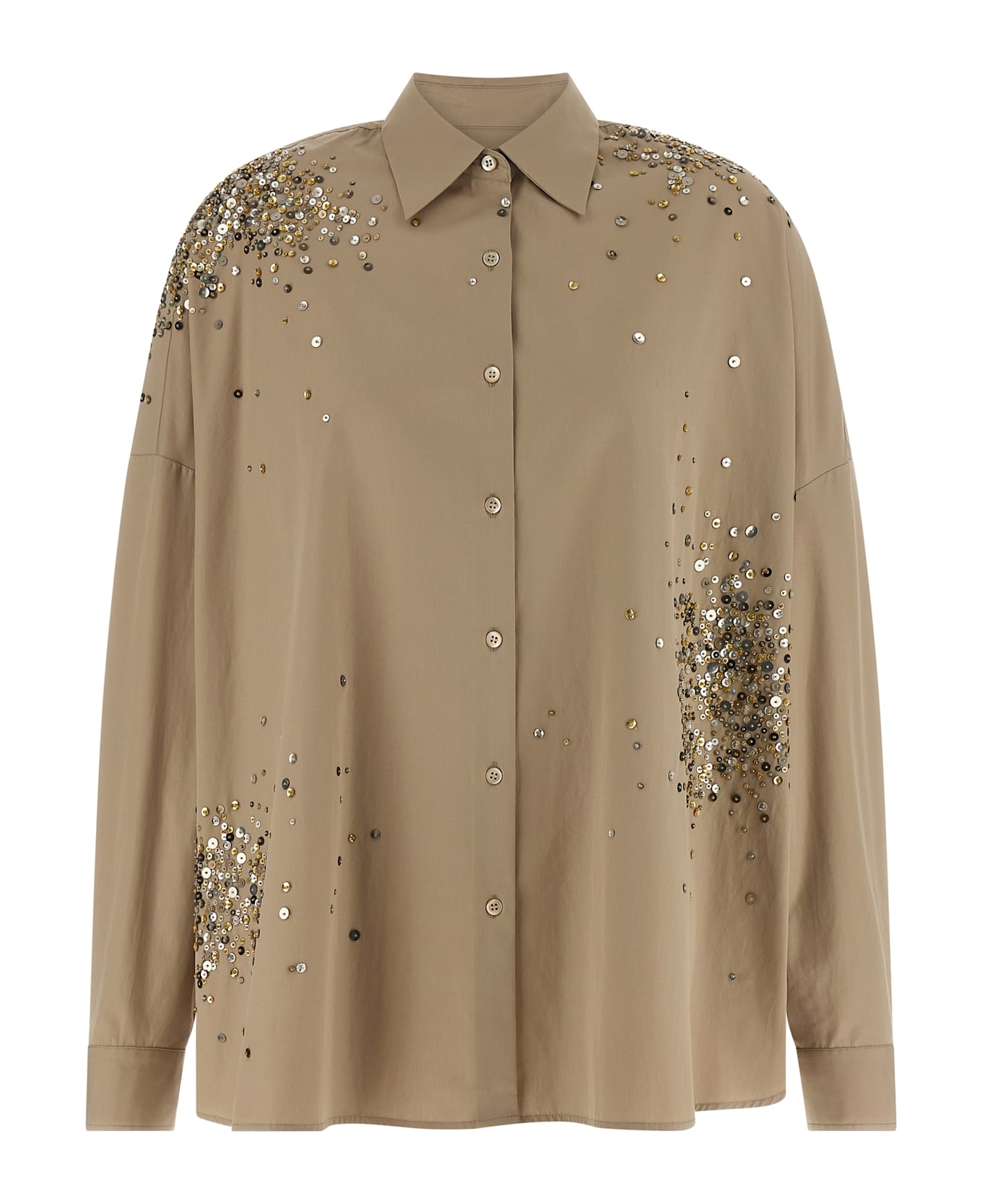 'Casia' cotton poplin shirt with sequin appliqué on the front and back, front button closure, long sleeves with cuffs and dropped shoulders.