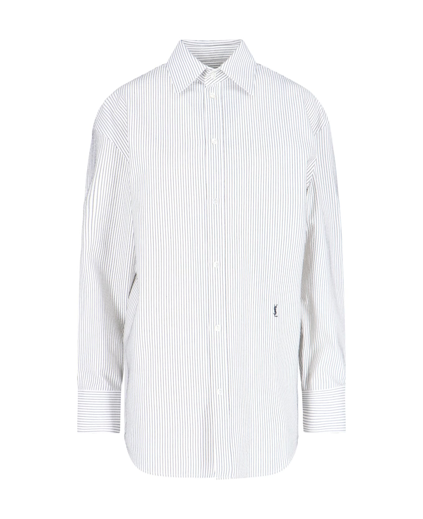 Saint Laurent 'Cassandre' striped shirt in white cotton with contrasting striped pattern, classic collar, button closure, contrast logo embroidery at the front, button cuffs, curved hem. Composition: 100% Cotton