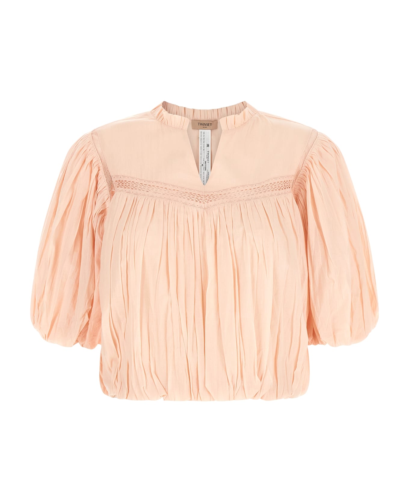 Cotton blouse, V-neck with ruffle detail, lace insert, doubled fabric with crinkled pattern, 3/4 sleeves, elastic on the bottom of the garment and on the sleeves. Composition: 100% cotton