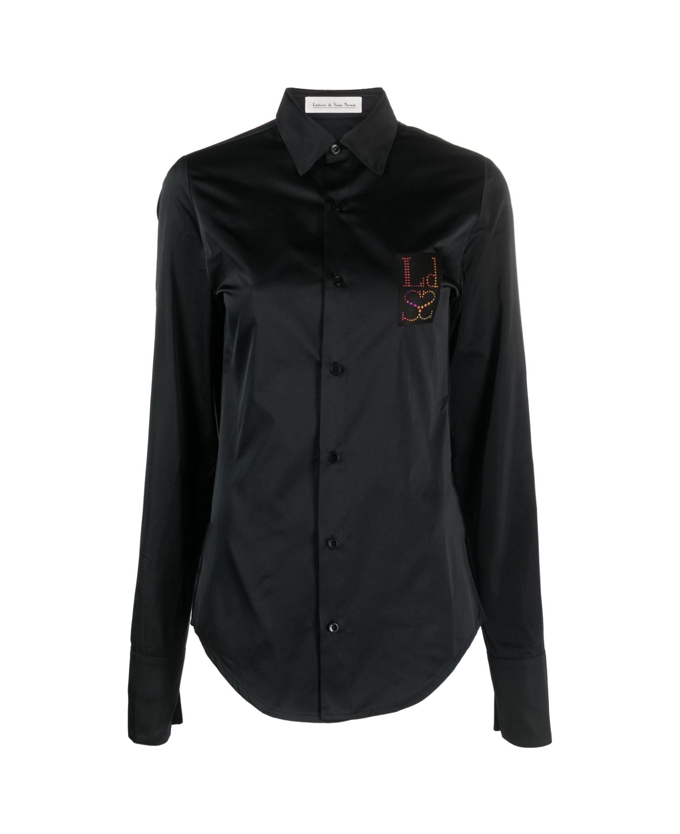 logo-patch satin shirt from Ludovic De Saint Sernin featuring black, satin finish, rhinestone embellishment, logo patch at the chest, straight-point collar, front button fastening, long sleeves, buttoned cuffs and curved hem.