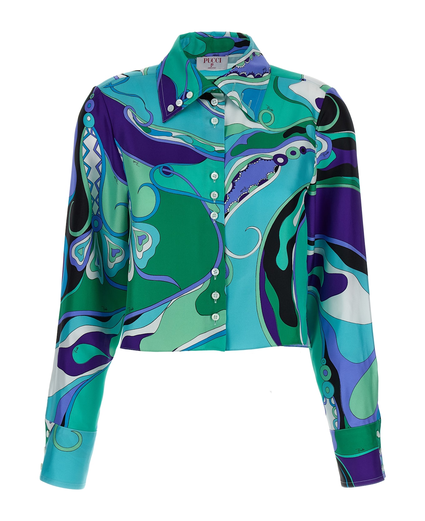 All-over Orchidee print silk twill shirt, crop model, button collar, long cuffed sleeves, side slits. This product, like many other Pucci items, is made with an all-over print that falls differently on each garment The product shipped may differ from the one in the picture.