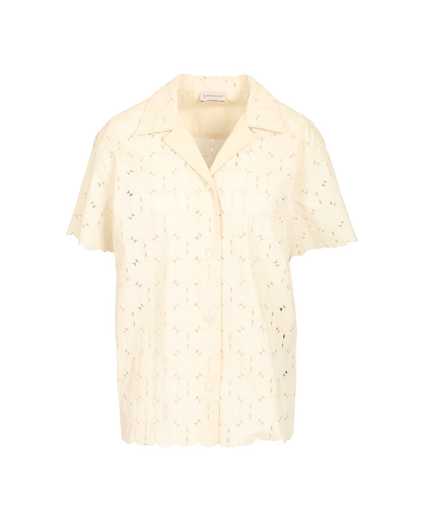 Short-sleeved shirt by Moncler in cotton blend with Sangallo lace, snap button fastening, logo patch, collar.