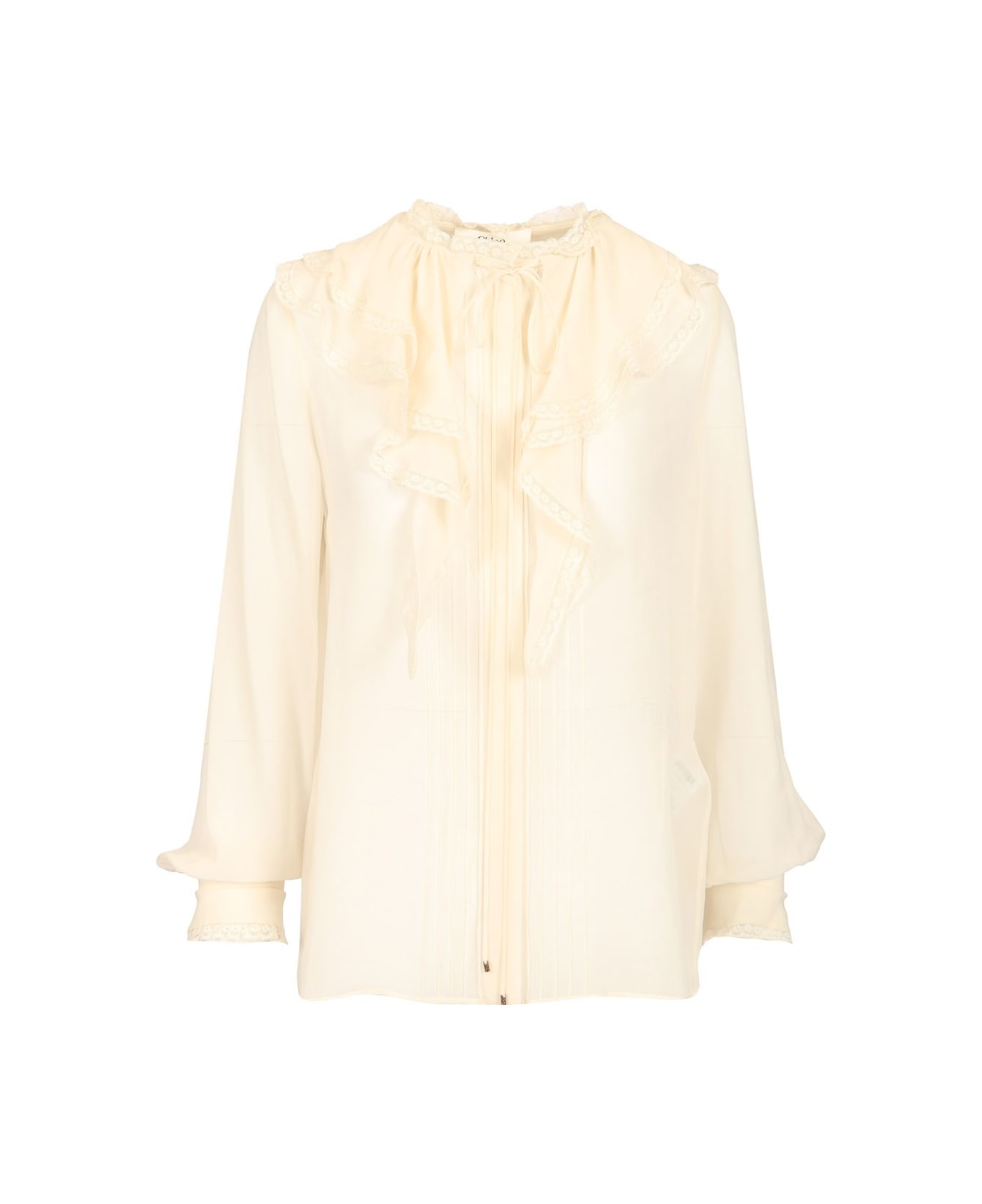 Silk georgette blouse from Chloè with ruffles, floral lace edge, mother-of-pearl buttons on the front and cuffs, laces with hammered metal ends, fluid fit.