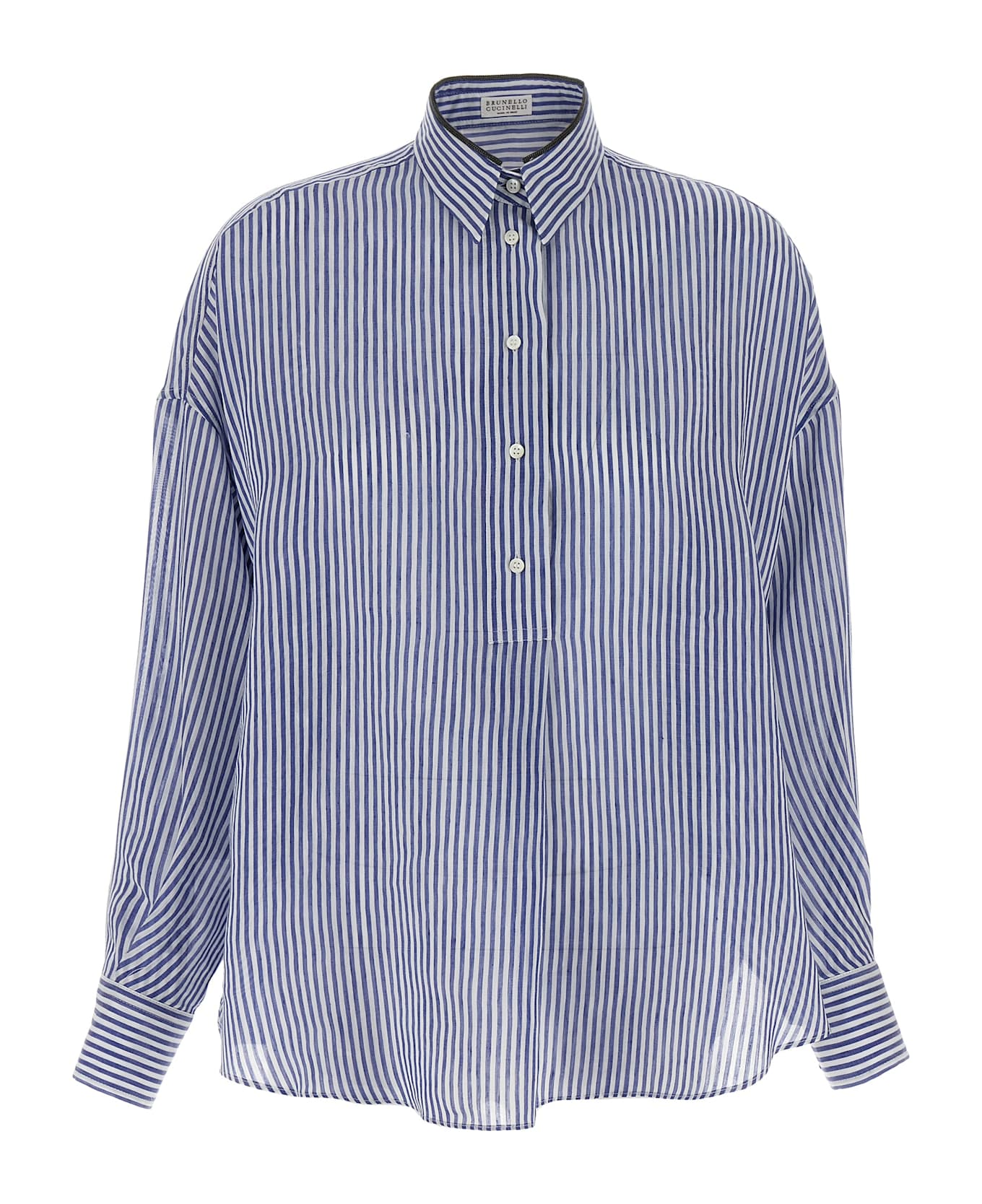 Striped cotton and silk blend shirt, pointed collar with jewel detail, front opening with buttons, side slits, long sleeves with cuffs. Composition: 78% linen, 22% silk