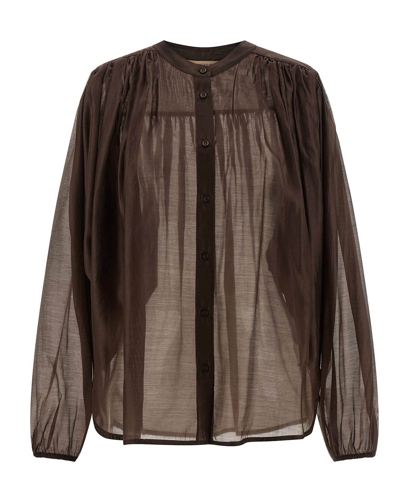 Semi-transparent fluid voile shirt, front and back curls, solide collar, front button closure, long puff sleeves with elastic cuffs. Composition: 85% lycra, 15% polyester