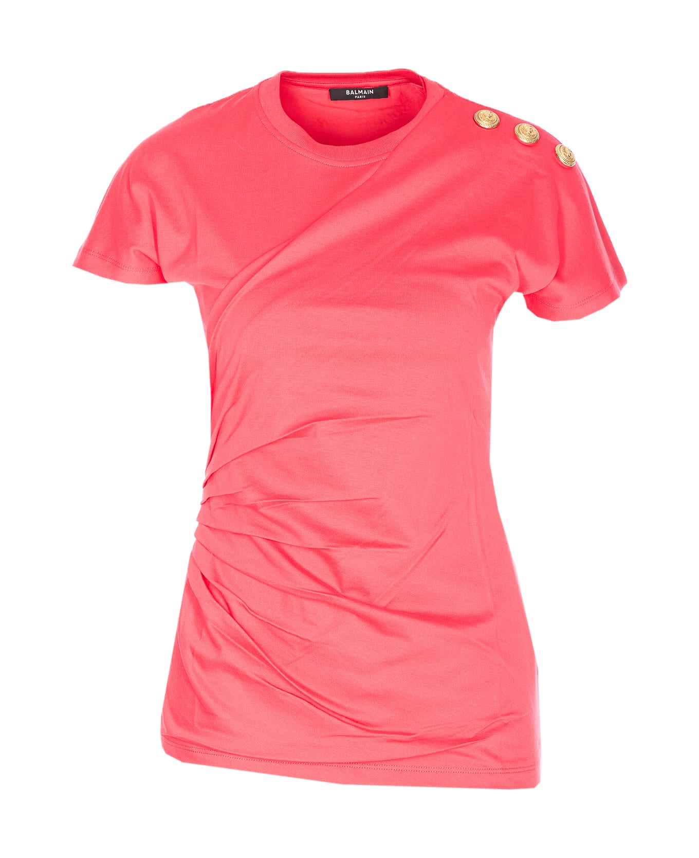 Balmain fuchsia 3 buttons draped t-shirt, crewneck, print on the back Composition: 100% Cotton, 95% Cotton, 5% Elastane