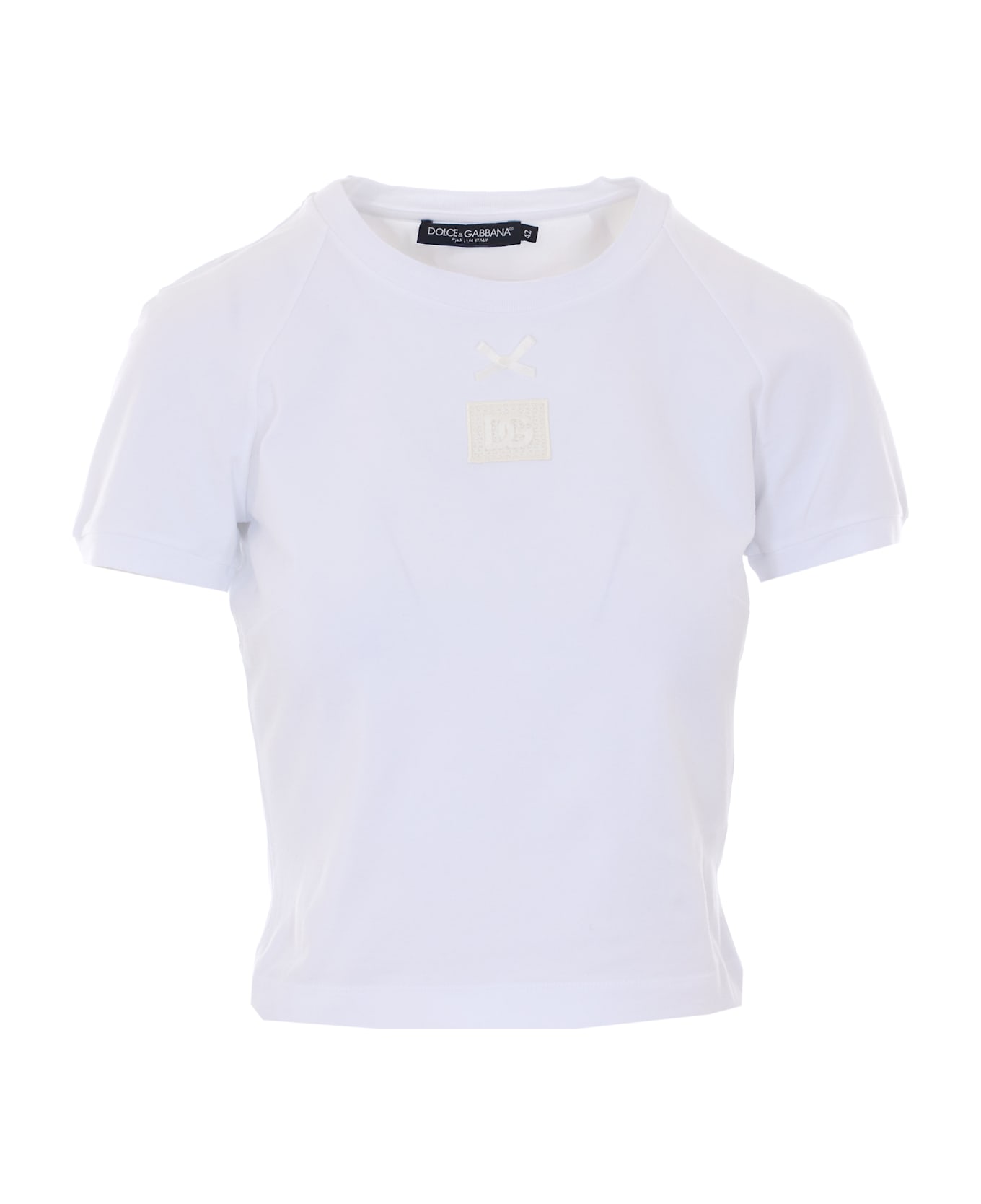 Dolce&Gabbana white t-shirt, crewneck, logo patch on front, with mini bow Composition: 90% Cotton, 10% Elastane