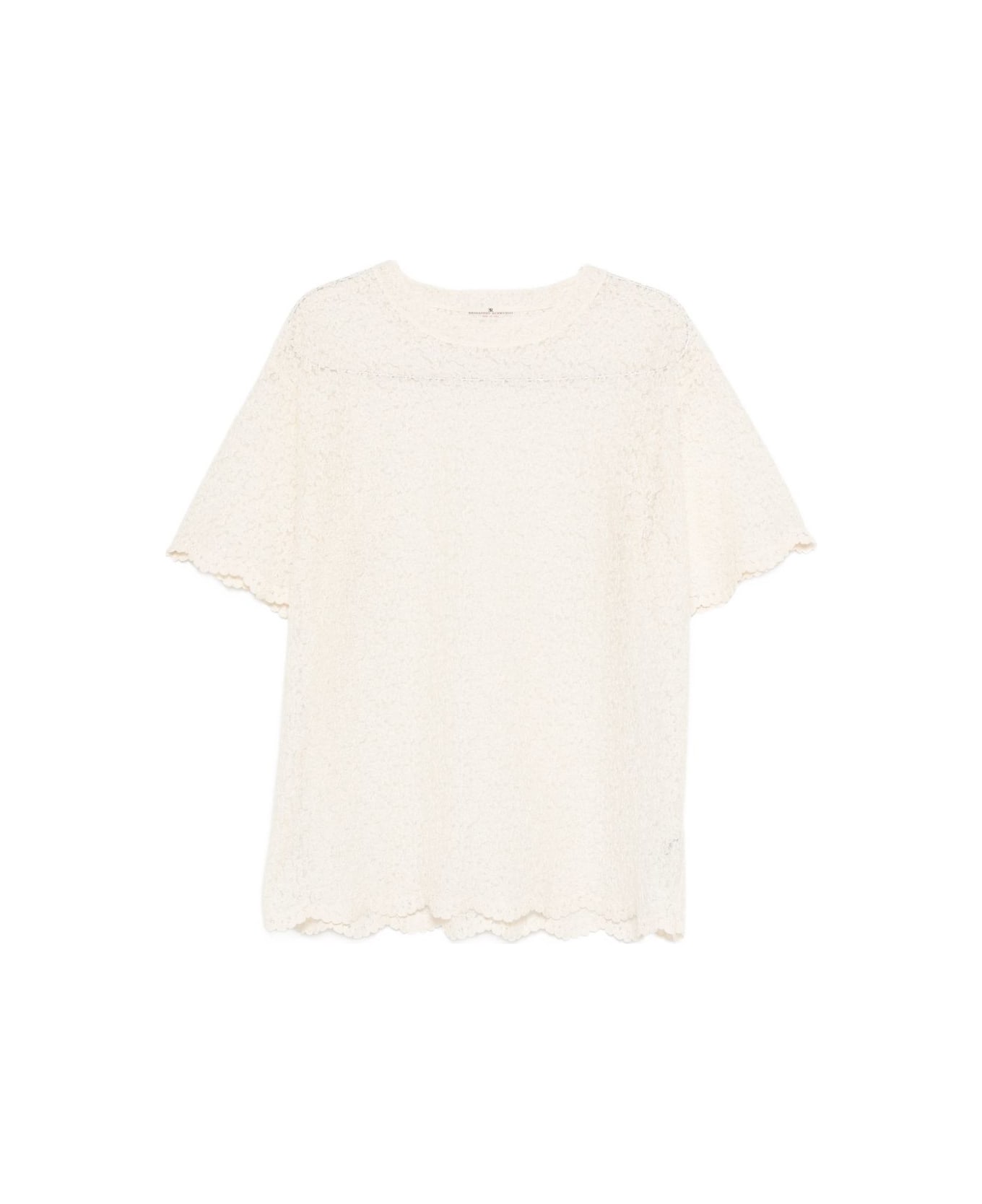 cream lace design scalloped hem short sleeves round neck