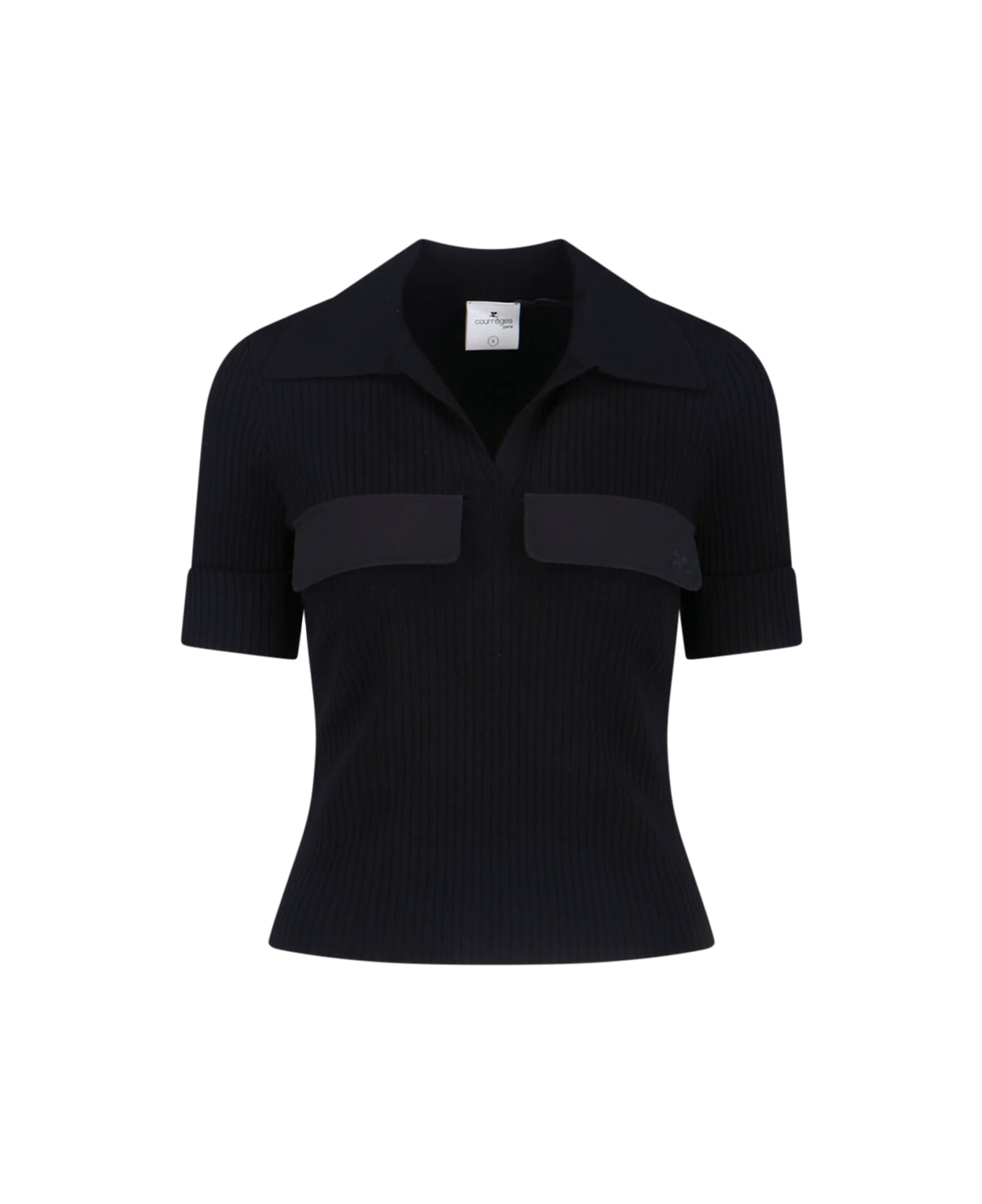 Courrèges logo polo shirt in black viscose blend with ribbed pattern, wide collar, two front pockets, tone-on-tone embroidered logo on the front, and straight hem.