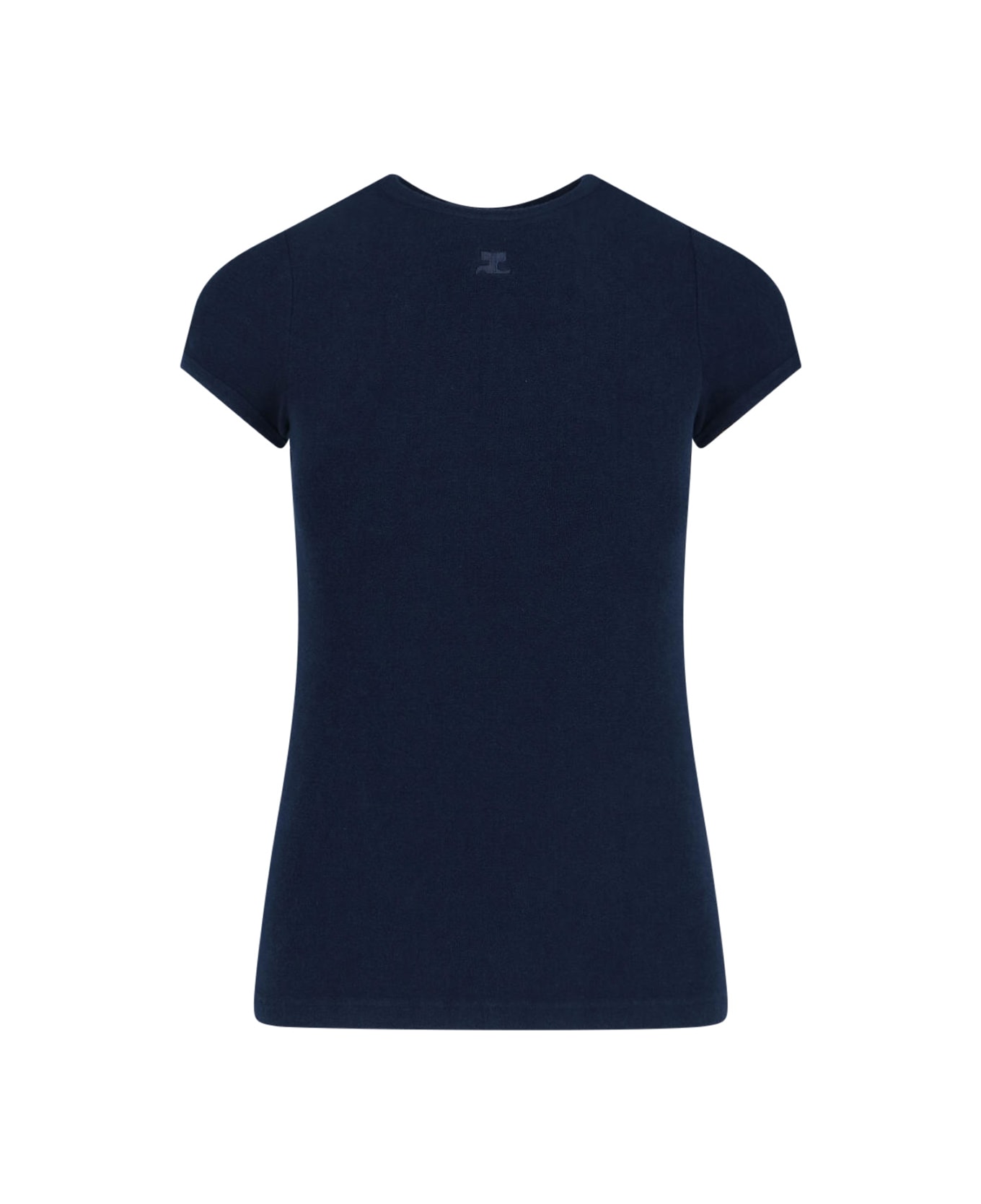Courrèges logo T-shirt in navy viscose blend with crewneck, short sleeves, tone-on-tone embroidered logo on the front, and straight hem. Composition: 84% Viscose, 16% Polyamide
