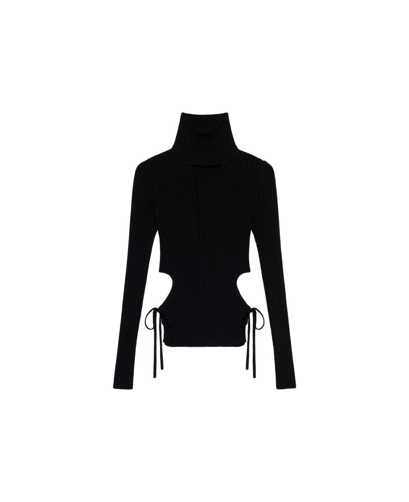 black ribbed knit turtleneck side cut-outs tie fastenings long sleeves