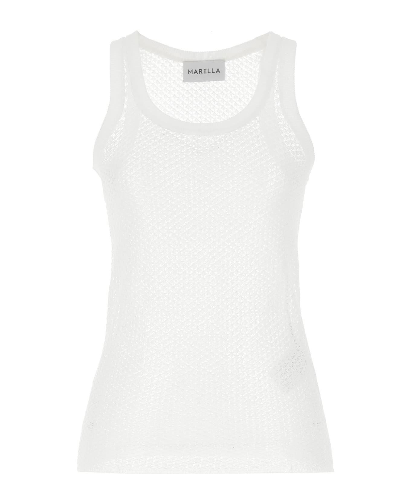 Emily Ratajkowski x Marella capsule top in perforated viscose blend knit with round neckline.